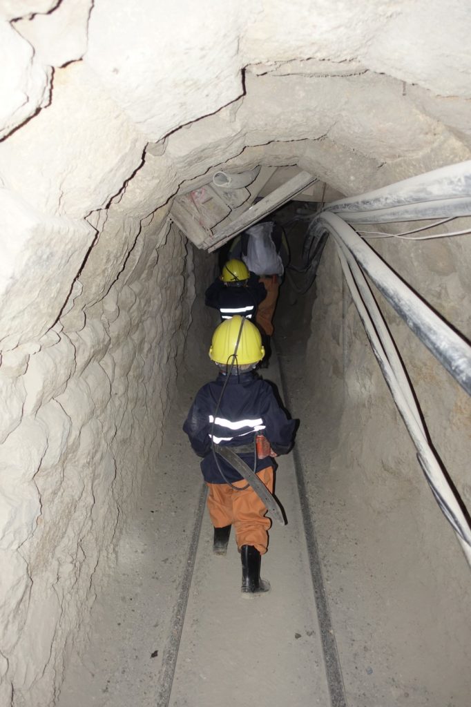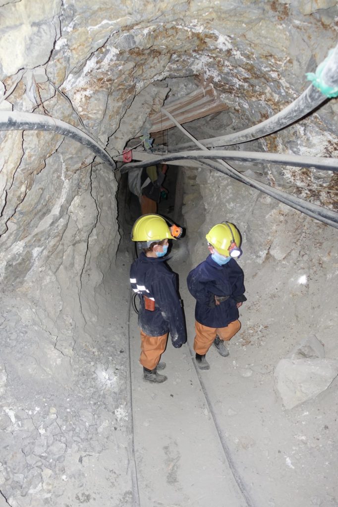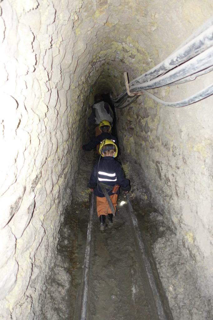 Nous nous enfonçons dans la mine. Les enfants suivent le guide.
