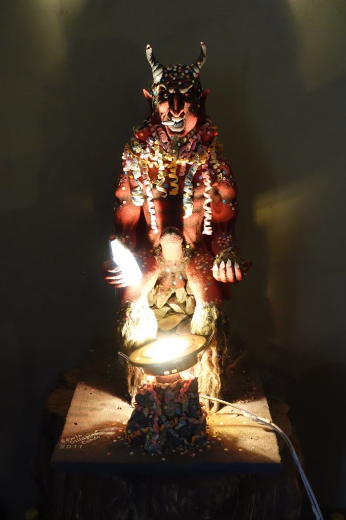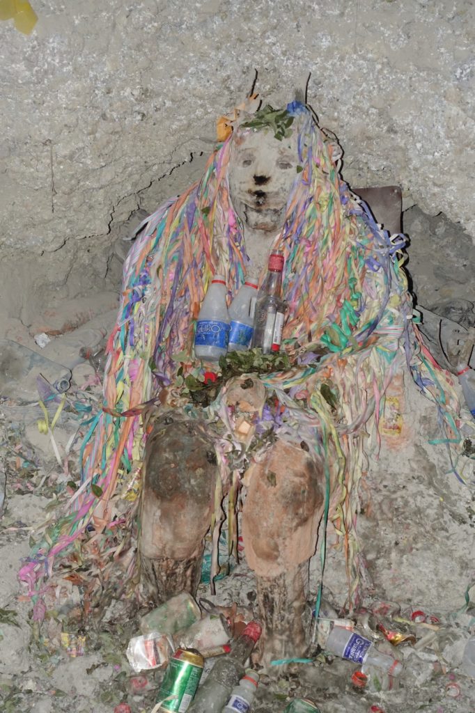 Nous arrivons près de Tio, le dieu de la mine. Les mineurs lui font des offrandes, des feuilles de coca, de l’alcool et des cigarettes, afin de lui demander une meilleure protection. Ils offrent aussi de l’alcool à la Pachamama (la Terre) en en renversant sur le sol.