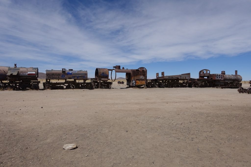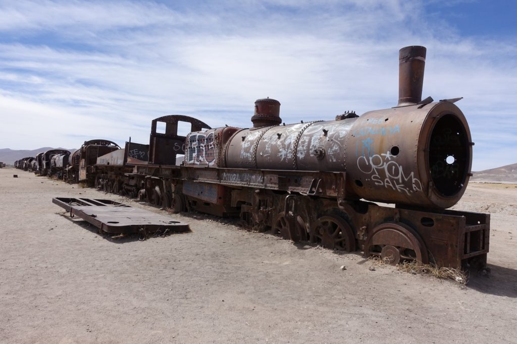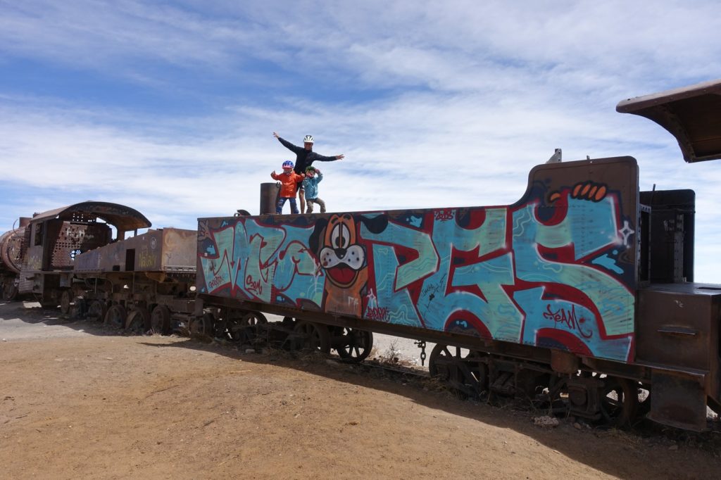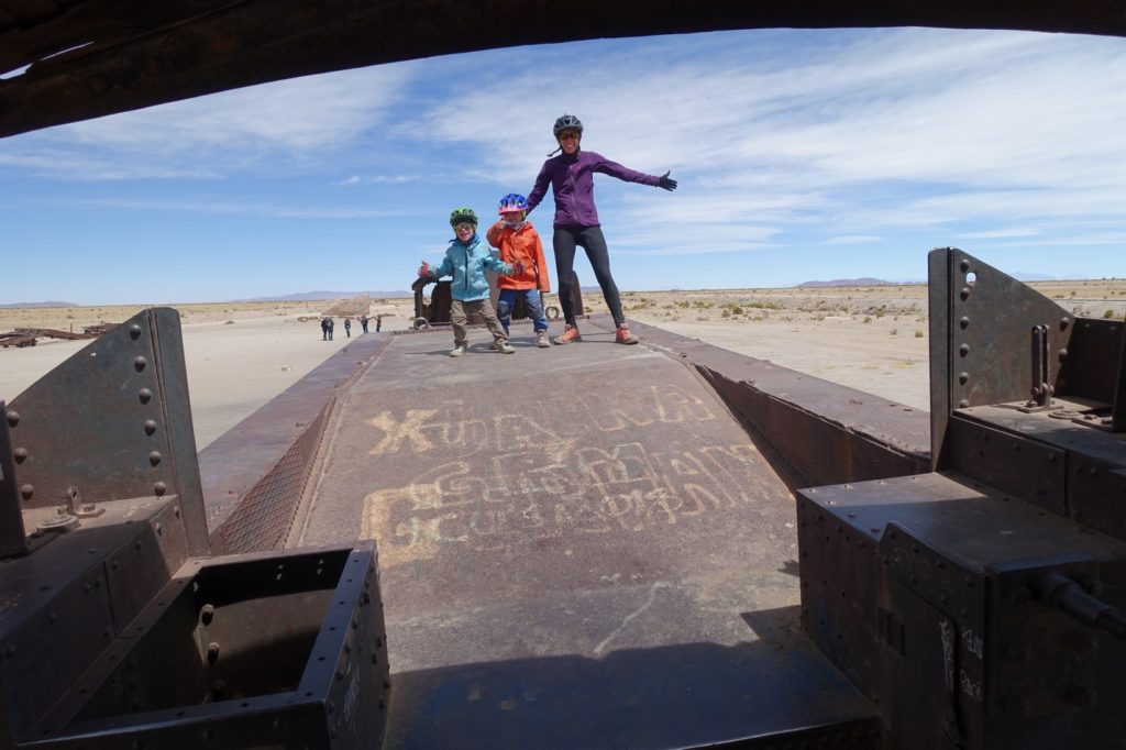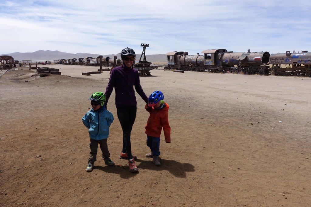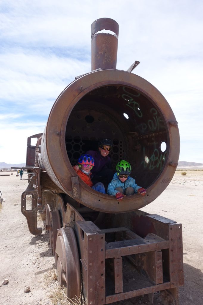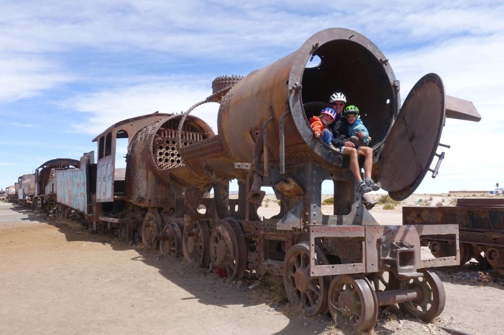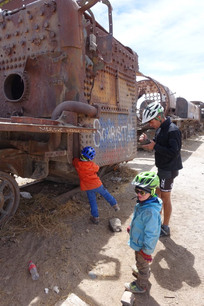 Nous roulons quelques kilomètres, nous avons le vent de côté, il souffle fort. Nous faisons une halte au cimetière des trains. Les enfants sont ravis de pouvoir monter à bord de ces vieilles locomotives. Nous faisons la cache et découvrons que les Hey Bro font du geocaching aussi.