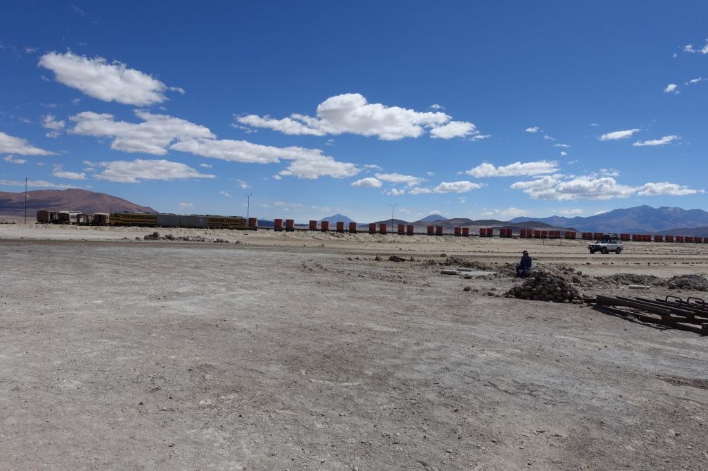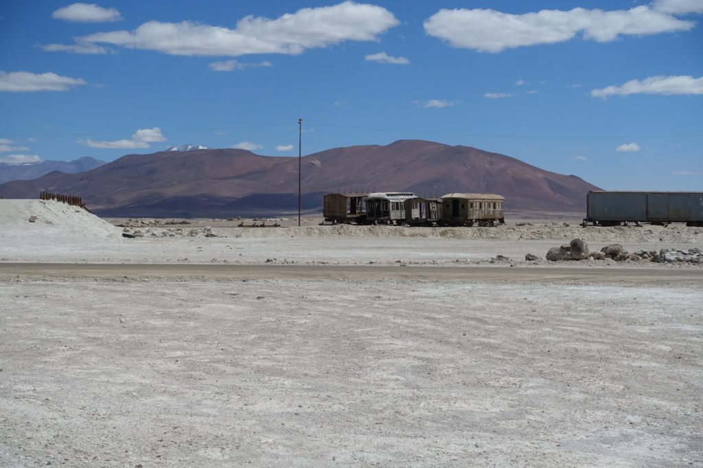 Nous arrivons donc à Ollagüe. C’est en fait une petite ville avec essentiellement des trains. Nous nous arrêtons à la première tienda que nous trouvons et nous mangeons des sandwichs et des chips. Nous faisons des courses (la tienda est bien fournie) puis allons vers la station de train pour voir si nous pouvons trouver un abri là-bas. Sur le chemin, nous passons devant les toilettes publiques où nous aurions pu camper mais ils sont fermés. A la gare, on nous dit qu’il n’y a pas de pièce de libre mais ils acceptent que nous campions sur le quai à l’abri du vent. C’est déjà ça.