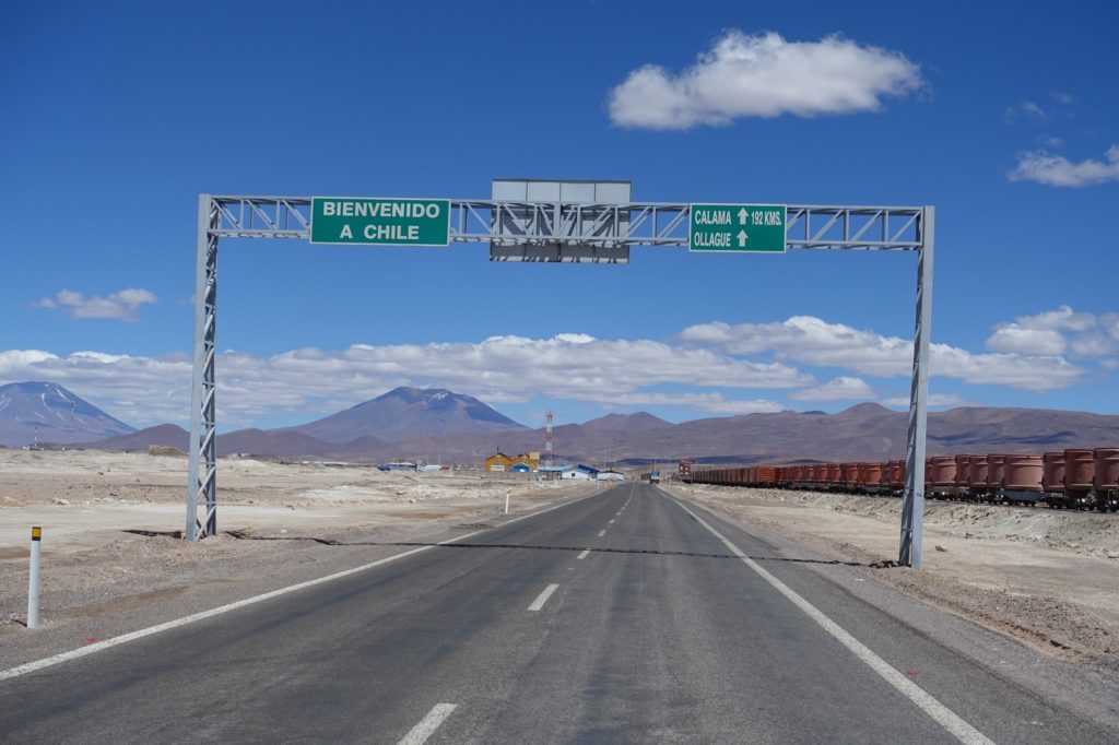 C’est donc à 11h00 que nous quittons l’école. Nous essayons d’aller dépenser et changer nos derniers bolivianos dans les tiendas vers le poste frontière mais tout est fermé. Nous allons donc faire tamponner nos passeports pour la sortie de Bolivie. L’agent de l’immigration offre des bananes aux enfants. Nous traversons ensuite le début du désert pour rejoindre le Chili. La frontière est nette, la route est goudronnée dès que nous passons la borne.