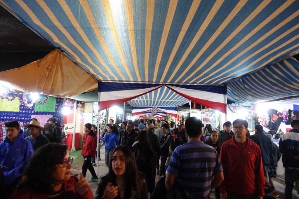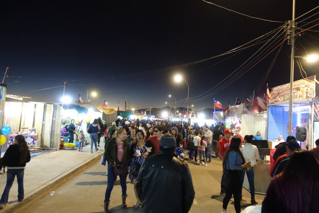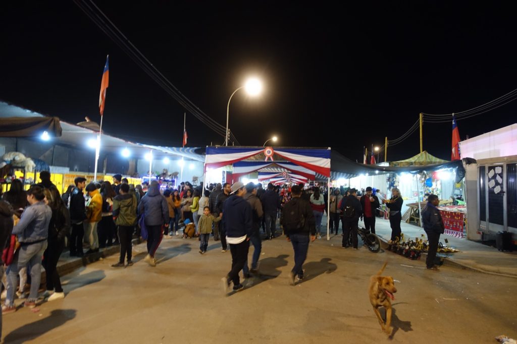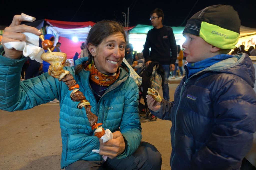 Pour le dîner, comme prévu, nous allons à la fête. Nous laissons les vélos sur le parking surveillé et allons nous promener dans les allées. Nous allons voir les gens danser puis allons acheter à manger. Nous commençons par des empañadas ensuite Maman achète une brochette de viande qui lui faisait de l’œil. Viennent ensuite des beignets, des churros et une barbe à papa. Comme prévu, les enfants ne la mangent pas…