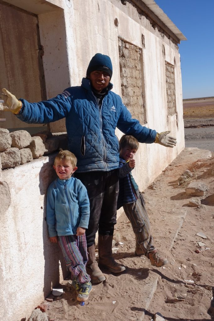 Pendant que nous rangeons les affaires, un pick-up arrive. Ce sont des argentins, ils restaurent la ruine pour ouvrir un hôtel-restaurant. Les enfants les aident dans leurs travaux. Nous discutons et leur faisons part de notre difficulté sur la piste. Ils proposent alors de nous récupérer en passant en fin d’après-midi pour nous emmener à San Antonio. Nous acceptons volontiers leur invitation !