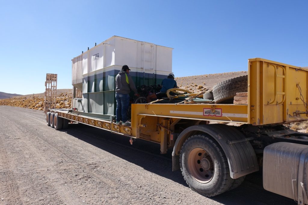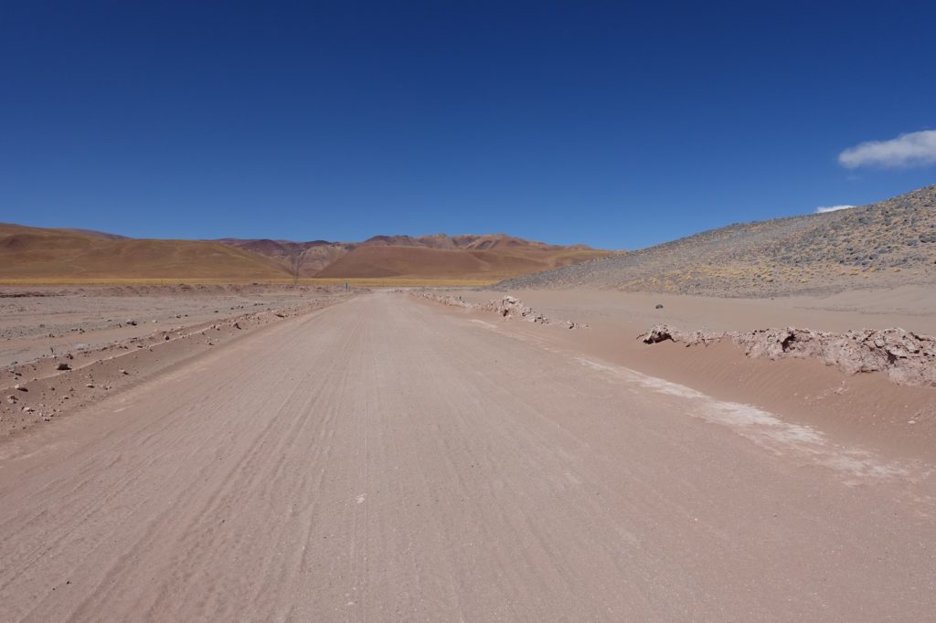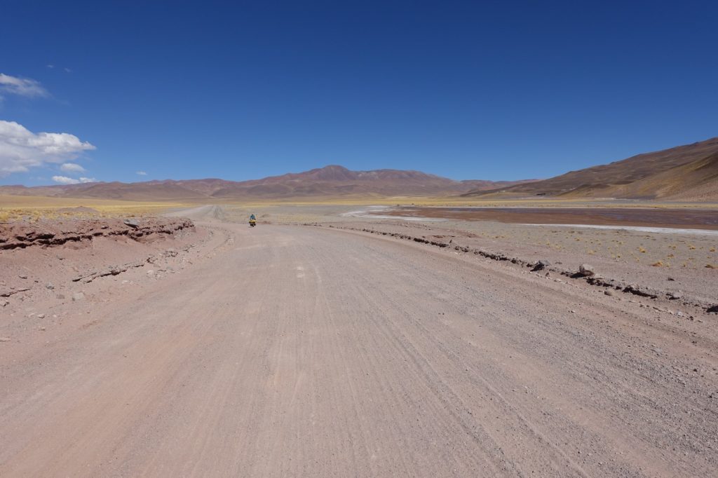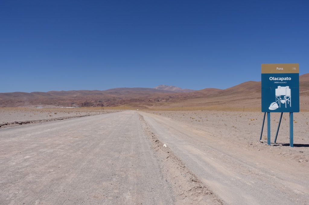 Nous nous mettons en route vers Olacapato. Nous allons tout de même rouler comme si nous devions rejoindre la ville par nos propres moyens. La piste est encore difficile sur cette portion. Nous arrêtons un pick-up qui passe et lui demandons de nous emmener. C’est impossible, il s’agit d’un véhicule d’entreprise et il s’arrête à la centrale un peu plus loin. Dommage. Cette centrale, c’est d’ailleurs un bout de la ligne haute tension que nous suivons depuis plusieurs jours. Il y a un énorme parc photovoltaïque d’une entreprise chinoise.