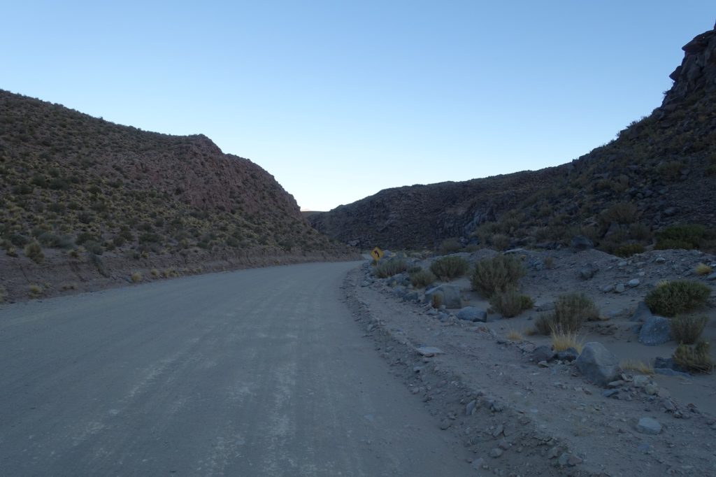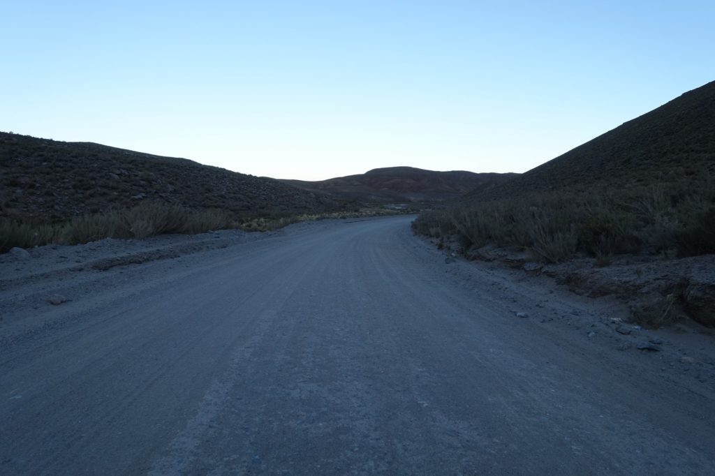 La descente est rapide au début, le soleil se couche. Nous passons une petite remontée puis c’est de la pente douce. Une voiture qui nous double nous dit de bien rouler à droite. Nous aimerions bien mais nous faisons comme nous pouvons… Nous passons là où la route est la meilleure !