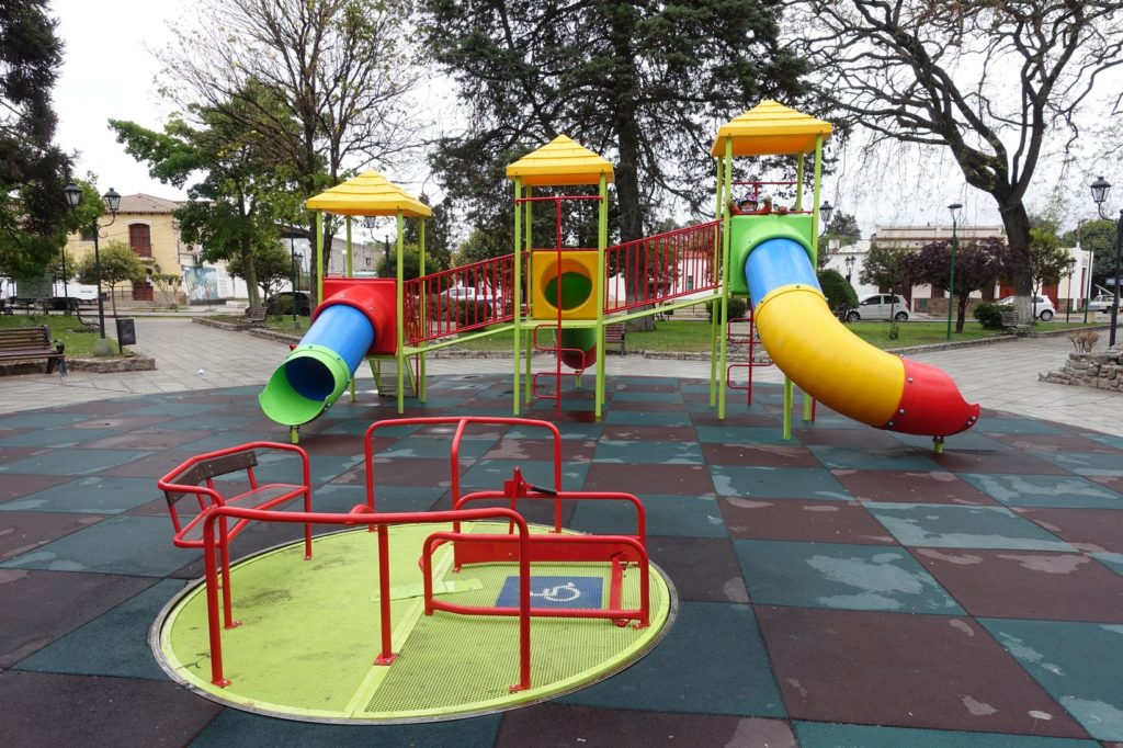 C’est sous un ciel gris que nous quittons Salta. La sortie de la ville est longue et ce n’est pas très beau. Nous avançons tout de même bien et faisons une pause à Cerrillos pour déjeuner. Il y a des jeux sur la place, les enfants sont contents. C’est la première fois que nous voyons un tourniquet accessible aux handicapés ! Vu le temps, nous ne traînons pas trop, il ne fait pas chaud du tout…