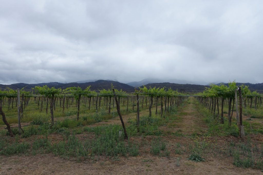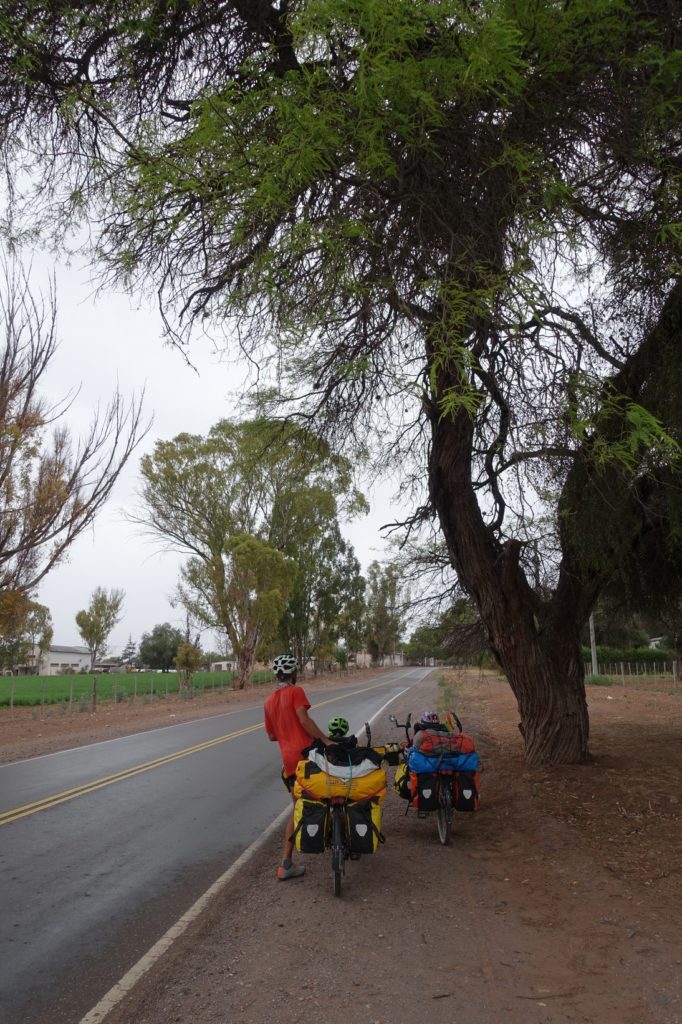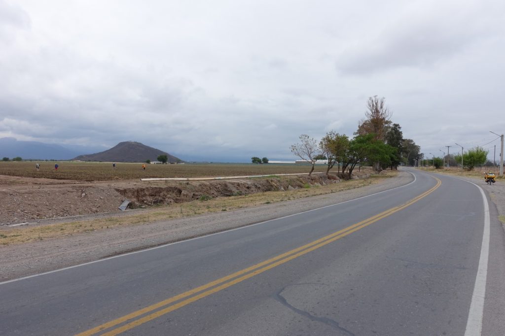 Nous repartons, toujours sous un ciel gris. Changement de décor, ce n’est plus la ruta del desierto mais la ruta del vino sur laquelle nous roulons désormais. Nous sommes dans une vallée agricole, pour le moment, nous ne voyons pas de vigne. Les nuages nous cachent les montagnes autour, c’est dommage.
