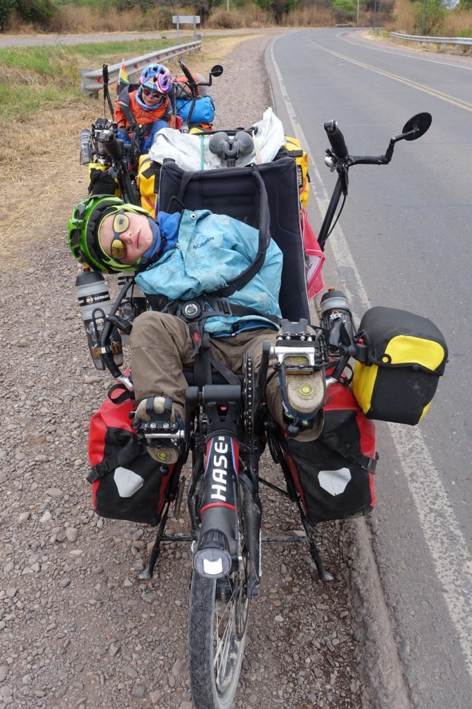 Nous visons le camping de la Viña. Maman commence à avoir mal au-dessus du genou gauche. Heureusement, nous sommes bientôt arrivés. Nous trouvons le camping mais quand nous arrivons le gérant n’est pas là. Nous sommes accueillis par une femme et ses filles, elles vivent là depuis deux jours. Elles tentent de le joindre en vain. Nous ne sommes pas les seuls cyclistes, Gabriel un uruguayen est là lui aussi. Amelia nous offre des boissons chaudes et donnent de la pâte à modeler aux enfants, ils sont ravis ! Les parents filent prendre une douche bien chaude, ça fait vraiment du bien !