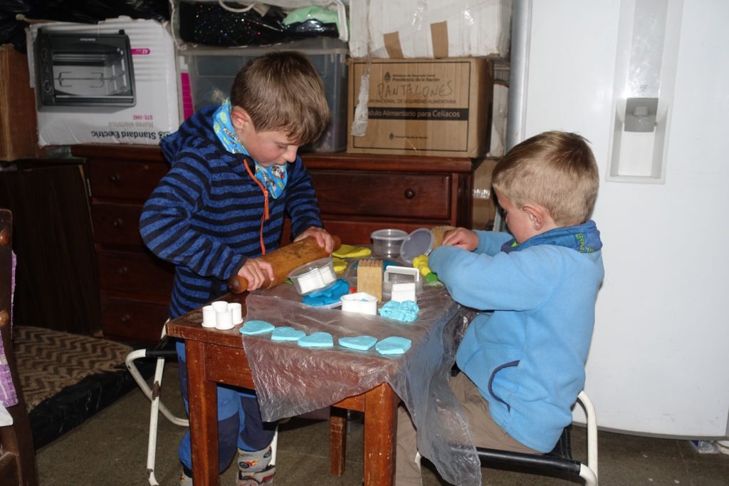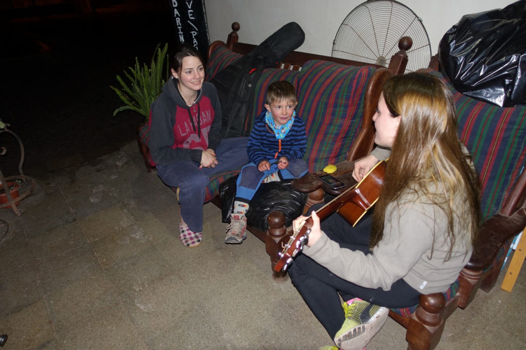 Amelia nous a proposé de partager une soupe, nous avons accepté mais nous avons oublié une chose importante, le rythme argentin n’est pas le notre ! Proposition un peu avant 21h30, sa fille part faire des courses et revient vers 22h30. Amelia lance la soupe, elle est finalement prête à minuit ! Ouch, c’est très (très) dur ! Les enfants sont cuits, les parents aussi. En l’attendant, Martin et Lucas ont continué de jouer avec la pâte à modeler puis ont écouté les jumelles chanter et jouer de la guitare ! Sofia leur offre un rosaire à chacun.