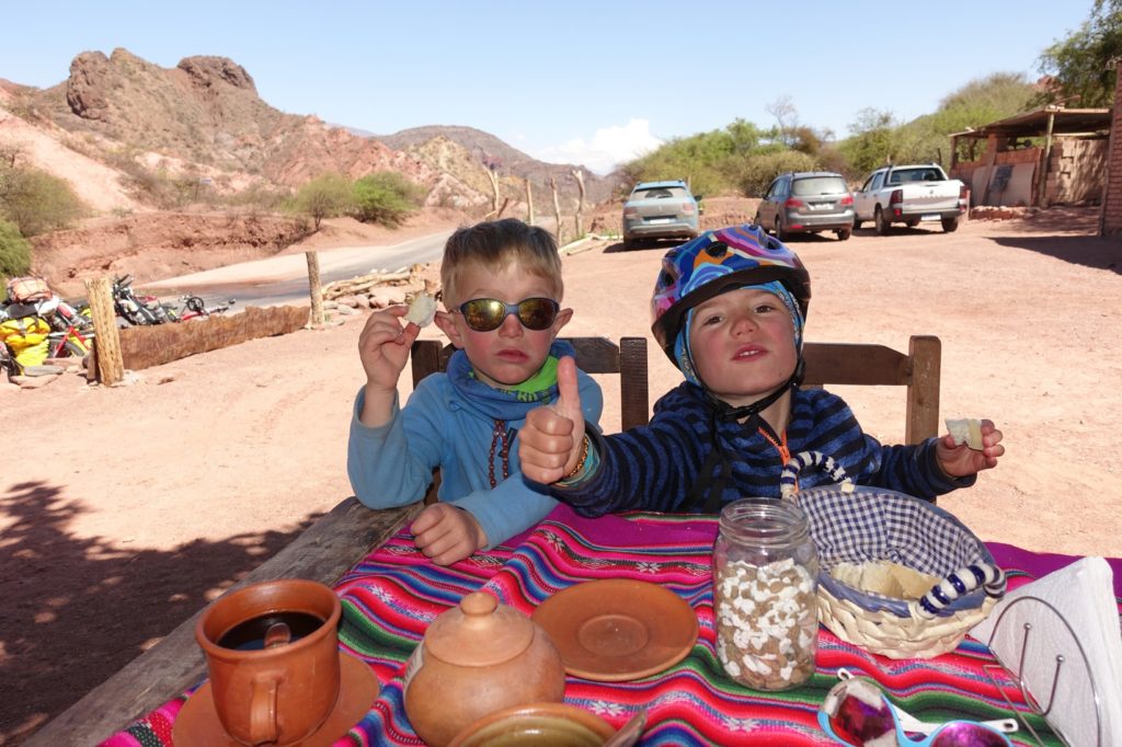 Nous faisons une pause café à las Abritas, nous retrouvons de nouveau Gabriel ! Les enfants jouent, nous mangeons du pain et du fromage. A ce rythme, nous allons vite reprendre tous les kilos que nous avons perdus !