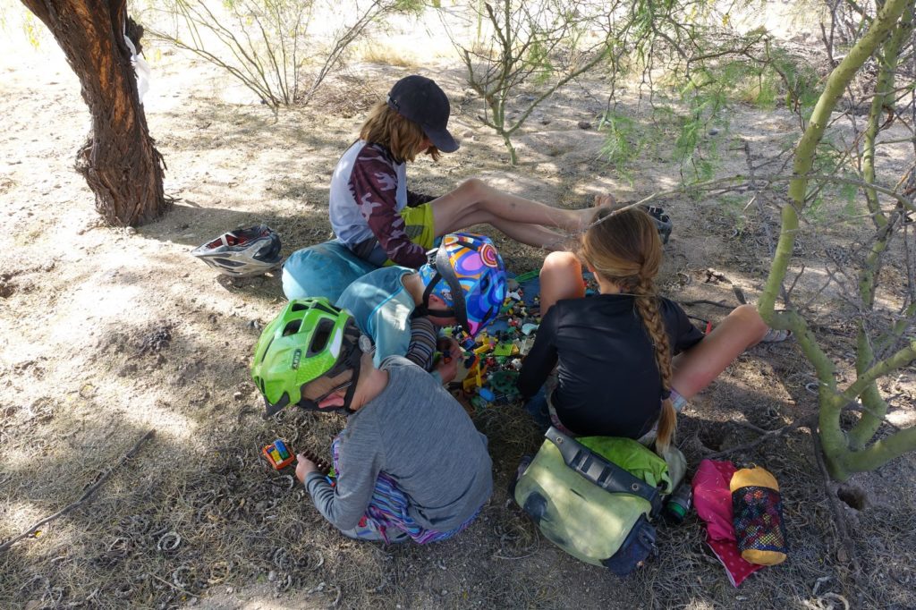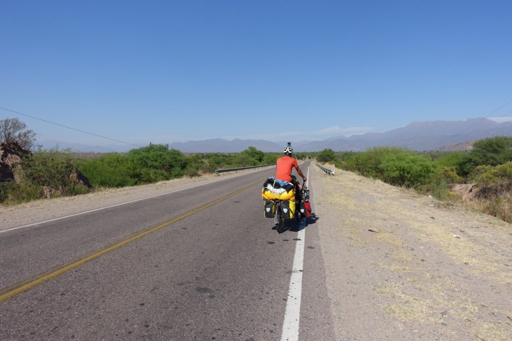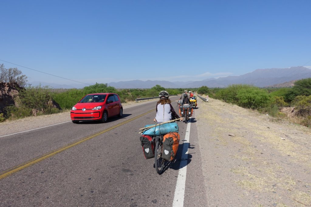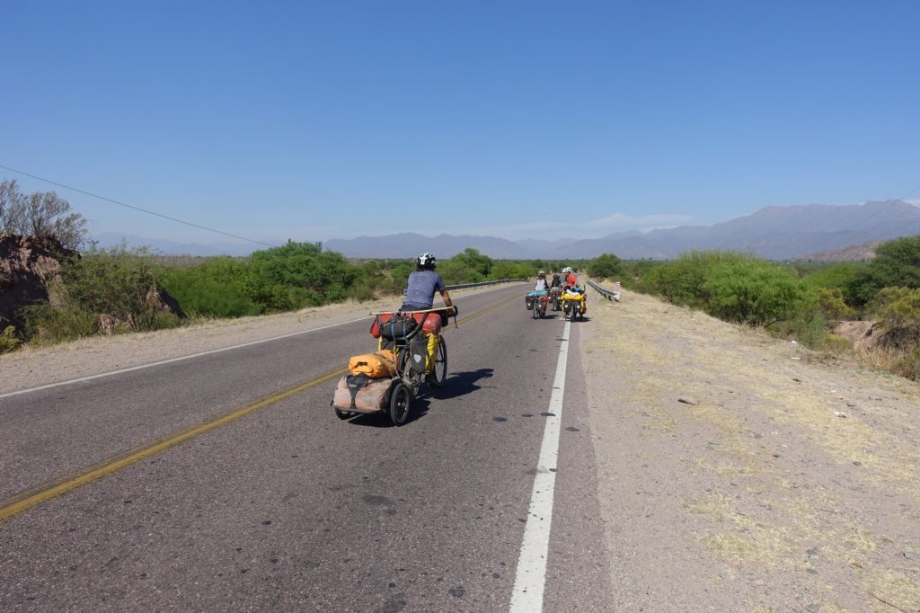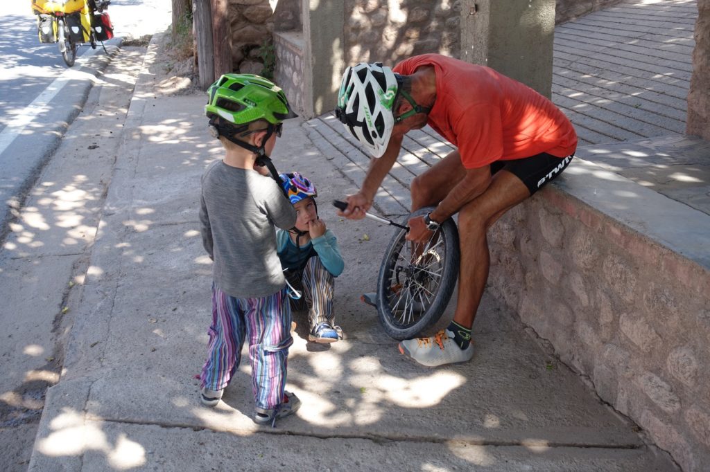 Les enfants ont déjà bien roulé, 60 kilomètres, ils commencent à en avoir marre. Il est un peu moins de 16h00 quand les EveilNomade décident de s’arrêter. Nous prenons le goûter avec eux, les enfants jouent. Nous aimerions rejoindre Chilecito en trois jours alors nous décidons de reprendre la route. Nous leur disons au revoir en espérant les revoir en Patagonie. Ils se rendent à la Rioja en espérant prendre un bus pour Mendoza puis un autre pour Santiago du Chili. Ils sont attendus début novembre pour faire du work-away à Puerto Montt.