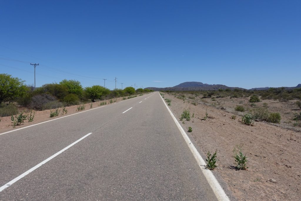 Voilà la RN 150. Elle part sur la droite, le vent est maintenant de côté. A Los Baldecitos, nous espérons faire quelques courses mais le seul kiosco est fermé. Zut ! Le prochain village est encore loin, peut-être pourrons-nous acheter un peu à manger au restaurant du parc. Nous prendrons au moins le déjeuner là-bas, nous économiserons notre nourriture.