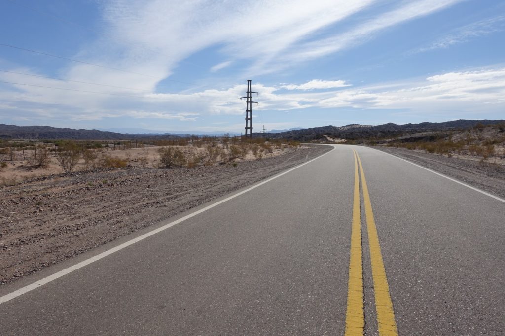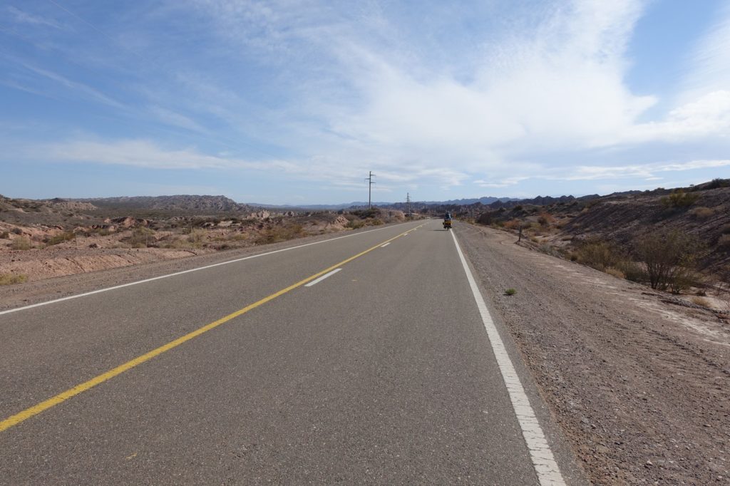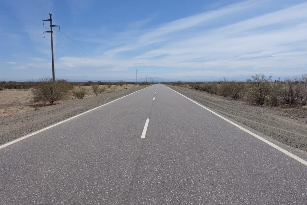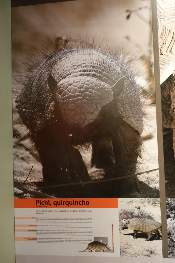 Nous rejoignons rapidement la RN 150, tournons à droite et commençons à nous battre contre cet ennemi invisible. A force, nous en avons ras le bol… Mais Maman voit un animal sur la gauche, il se dirige vers un mara qui a été écrasé pour en manger un bout. C’est un pichi ! Notre premier ! Youpi ! Bon, comme d’habitude, nous regardons l’animal et Maman ne prend pas de photo, désolés… Ça y est, il nous a vu, il file à toute allure.