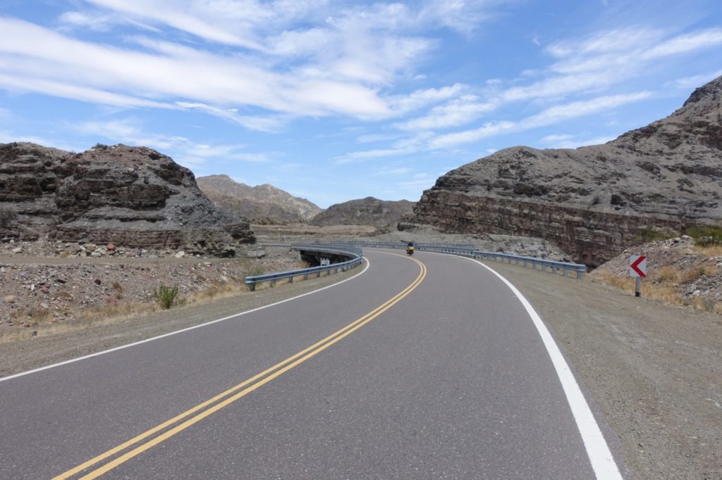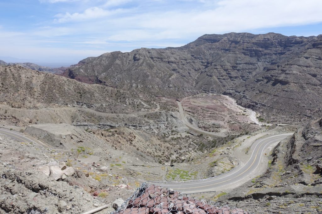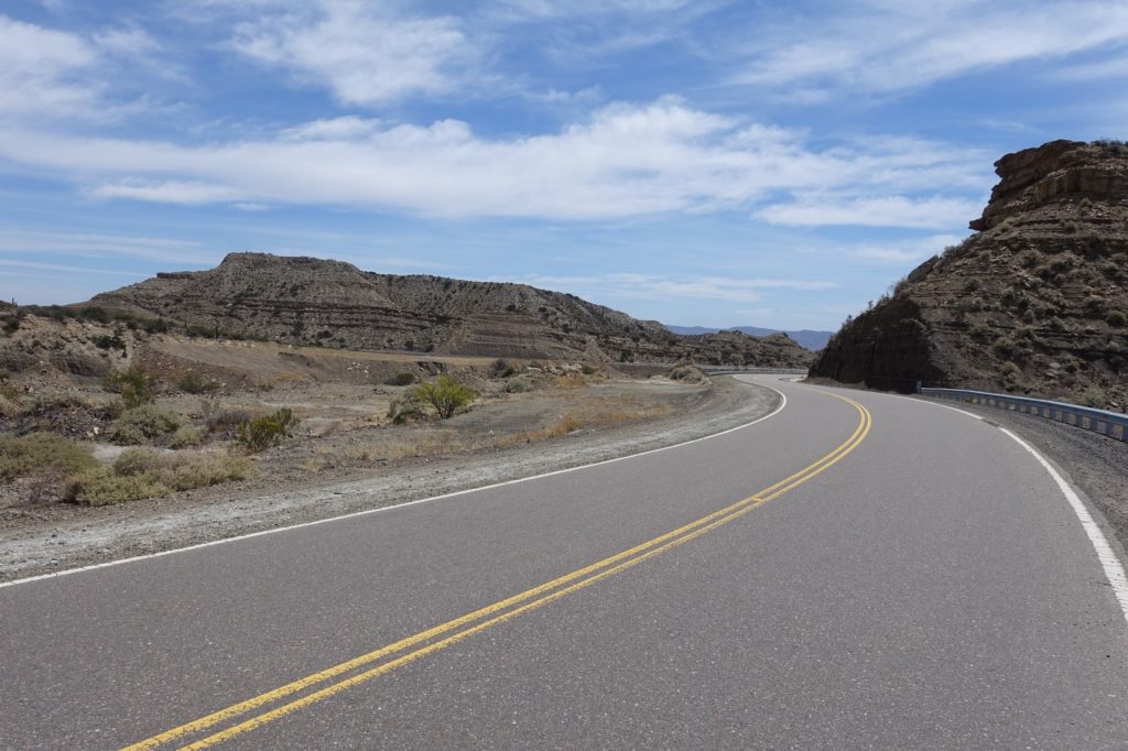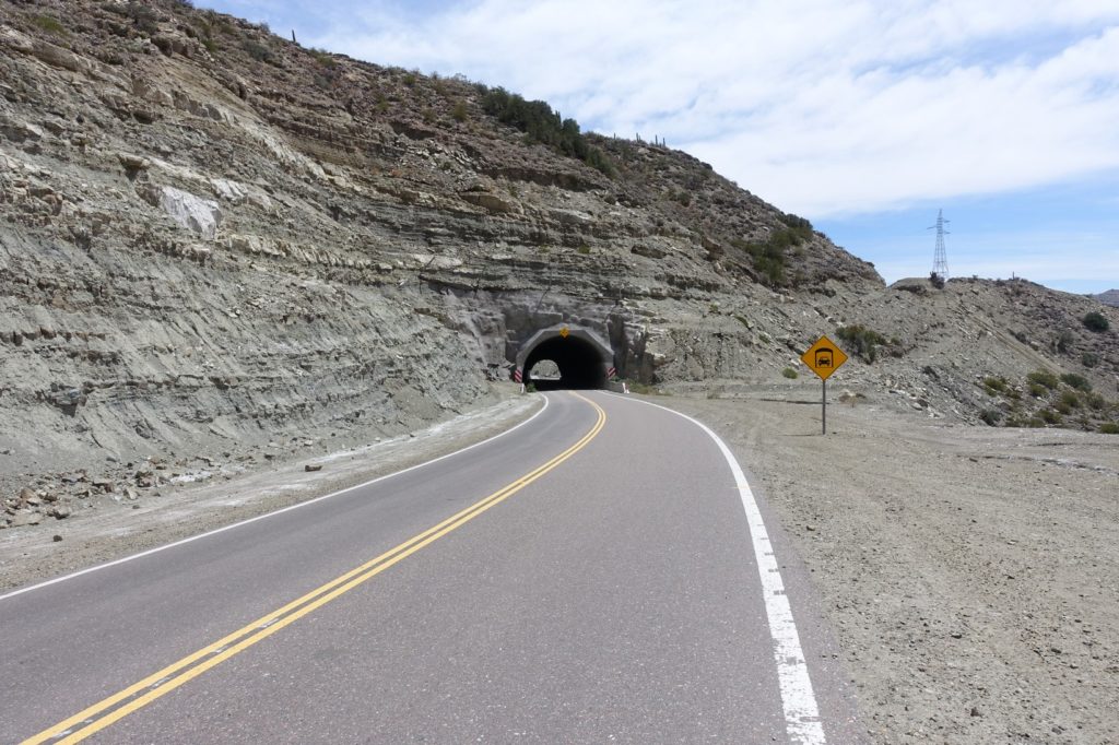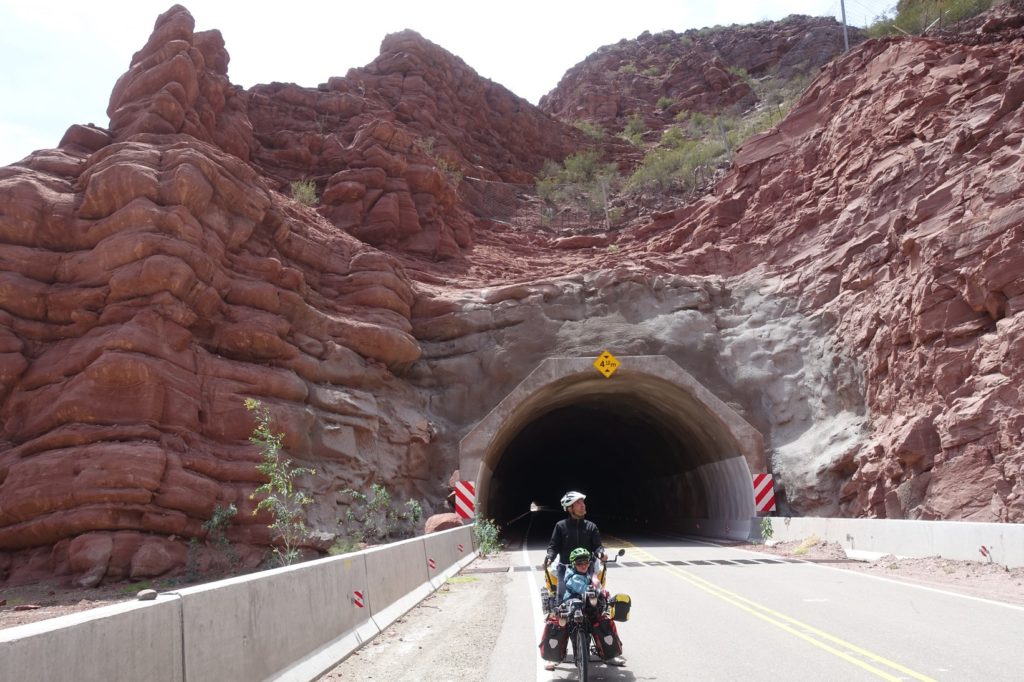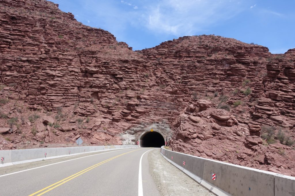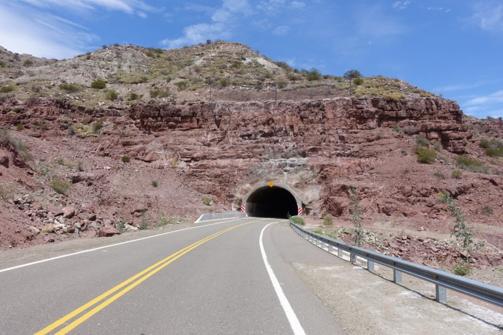 Voilà la descente qui nous attend ! La route semble superbe et elle l’est ! De temps en temps, nous sommes stoppés net par le vent mais nous nous faisons plaisir ! Nous empruntons les six tunnels pour le plus grand bonheur des enfants. A chaque fois, le vent s’engouffre, là aussi, nous sommes bien freinés. Les roches changent de couleur. Encore une fois, ça fait du bien de voir autre chose que la pampa !