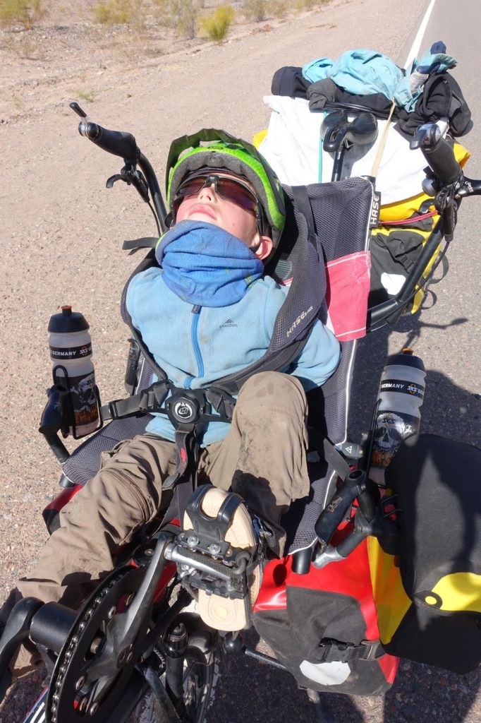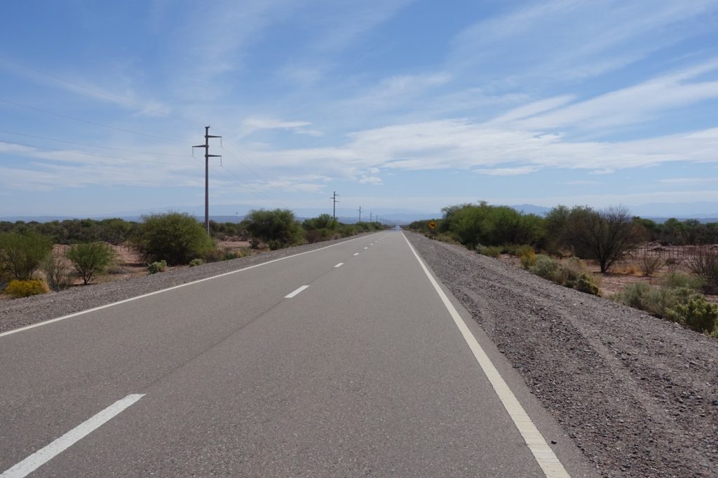 Ensuite, nous ne rigolons plus… Revoilà la plaine, ses lignes droites, son vent… Pfff… Nous sommes doublés par un pick-up qui s’arrête juste après. Le conducteur, Eduardo, nous dit qu’il fait souvent cette route. Il a vu il n’y a pas longtemps une famille avec une carriole. Il pensait alors avoir tout vu mais avec nous, c’est la cerise sur le gâteau. Heureusement qu’il n’a pas croisé la Velove Family (avec deux pinos et une carriole) ! Il adore. Il va donner des cours à Huaco et nous propose de le rejoindre là-bas pour nous emmener à San Juan dans sa voiture. Le soucis, c’est que c’est encore loin et qu’il termine entre 21h00 et 22h00. Nous prenons son numéro au cas où mais n’y croyons pas trop… Avant de partir, il nous offre des biscuits, cool !