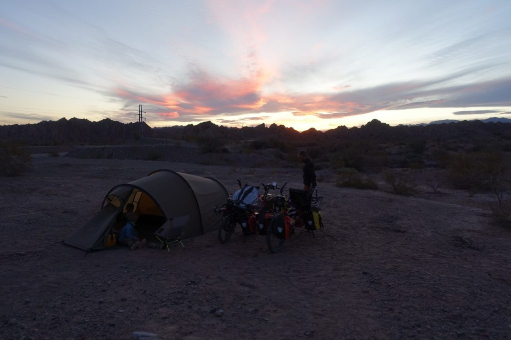Il est presque 17h30, nous cherchons un endroit pour bivouaquer. Ce n’est pas évident, il y a des clôtures un peu partout, de la pente et nous ne voulons pas dormir sous la ligne électrique. Nous finissons par trouver un petit coin derrière une clôture ouverte. Nous montons la tente, les enfants ont le temps de jouer. Nous dînons tôt et avons le temps de faire des parties de Uno avant le coucher du soleil. Papa est crevé, il se couche avec les enfants pendant que Maman écrit l’article du jour. Martin et Lucas s’endorment au final quand Maman se couche, comme souvent, il n’y a pas un bruit, le paradis…