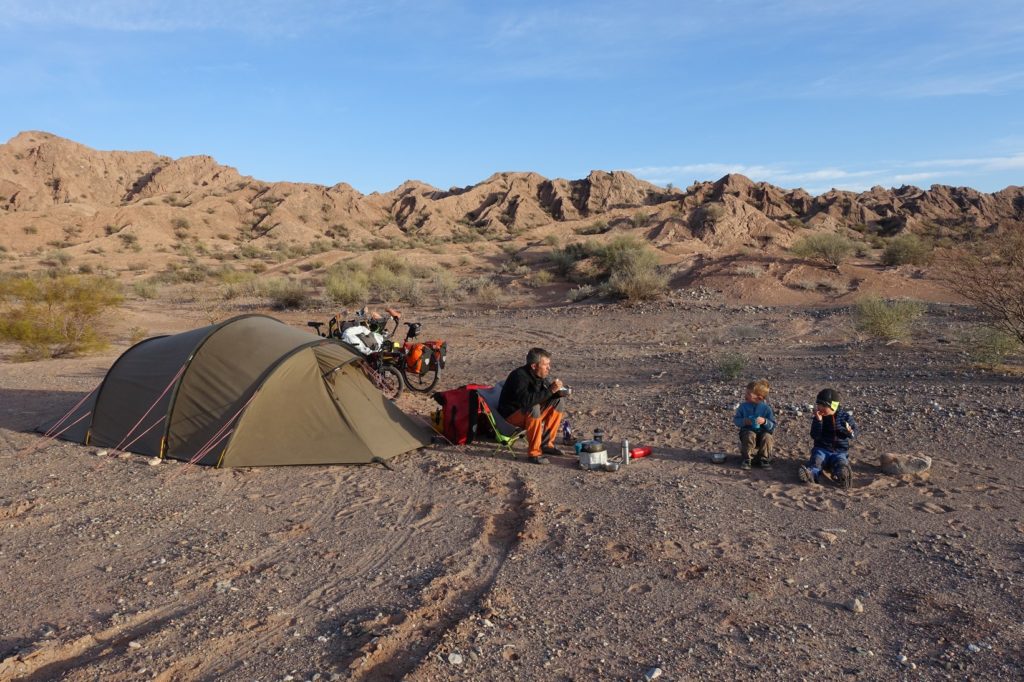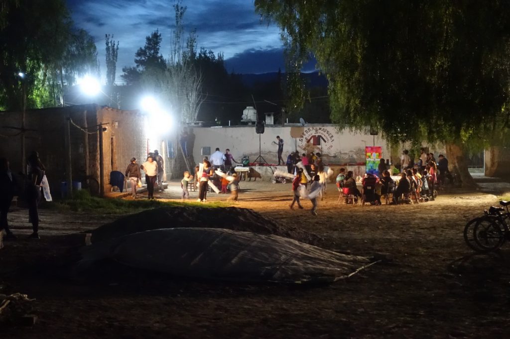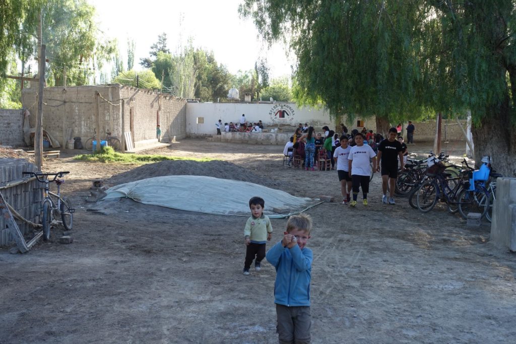 Nous demandons à des personnes qui se trouvent au stade si nous pouvons camper là. « Aucun soucis, il y a juste un meeting politique qui doit se terminer à 20h00. Mais après pas de problème ». Tout le stade est inondé, il nous faut donc planter la tente à côté des bâtiments. Attendre 20h00 inquiète un peu Maman, elle n’est pas très chaude pour le coup. Papa fait le tour du village, demande à la police, qui a un superbe jardin ombragé, « pas possible de camper dans le village, il y a un camping vers Jachal (retour arrière) ». Bon, ben, en attendant, nous nous faisons à dîner. Beaucoup de monde arrive, des femmes et des enfants. Les gens s’installent. Vers 19h30, ils installent des enceintes… Puis c’est un loto qui commence !