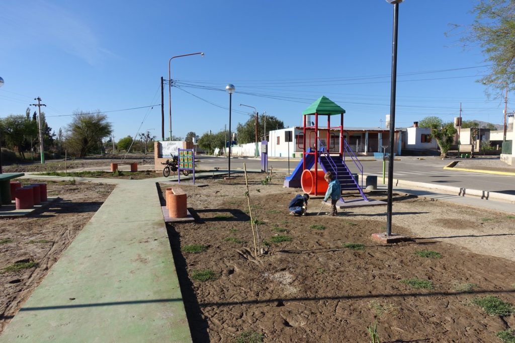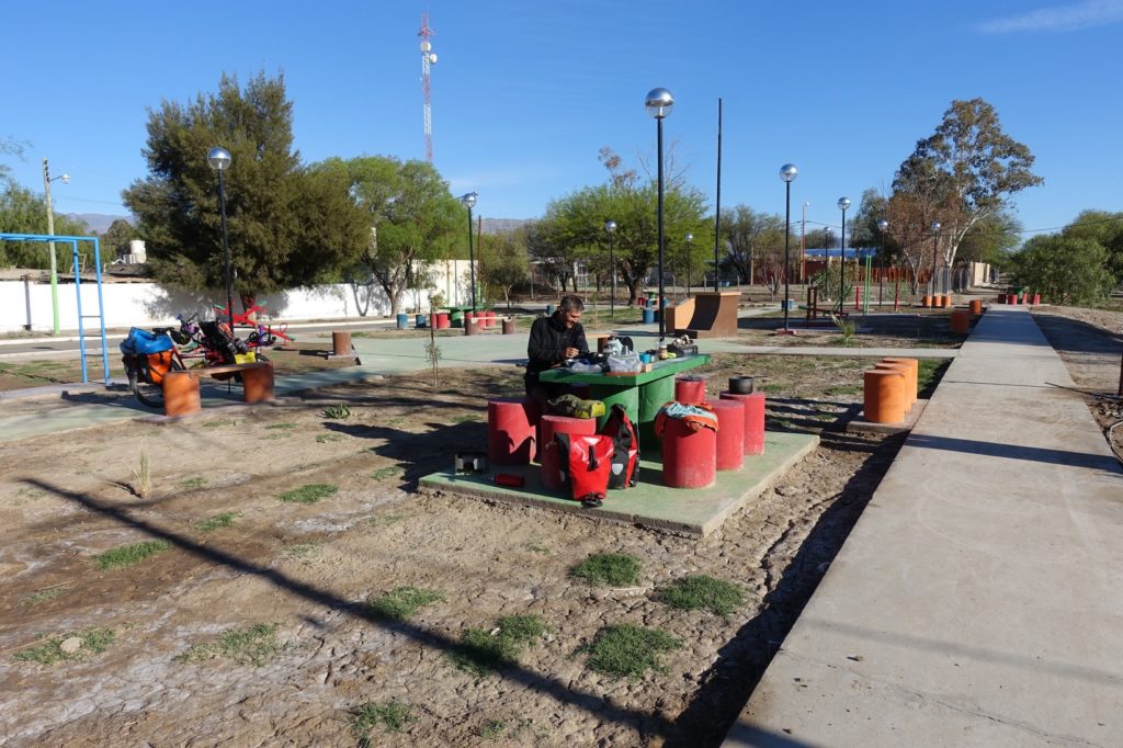 Nous atteignons Talacasto pour le goûter. Nous nous posons à l’ombre et dégustons boissons fraîches, boissons chaudes et tartelettes. Nous discutons de notre itinéraire avec les serveurs, ils nous apprennent que la situation n’est pas géniale au Chili, il y aurait même le couvre-feu d’instauré… C’est peut-être uniquement à Santiago… Il nous faudra vérifier ça quand nous aurons internet !