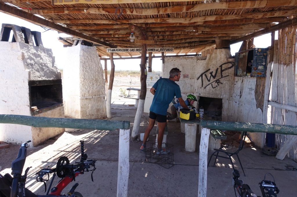 De nouveau, 30 kilomètres de parcourus, nous atteignons un campamiento de la DNV (équivalent de la DDE chez nous). Nous allons demander si nous pouvons profiter de l’ombre pour déjeuner et refaire le plein d’eau. Alejandro et Alfredo nous invitent à entrer et nous offrent de la soupe ! Nous ne nous attendions pas à un si bon accueil !
