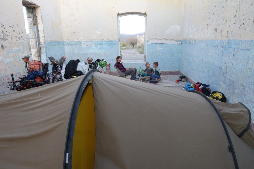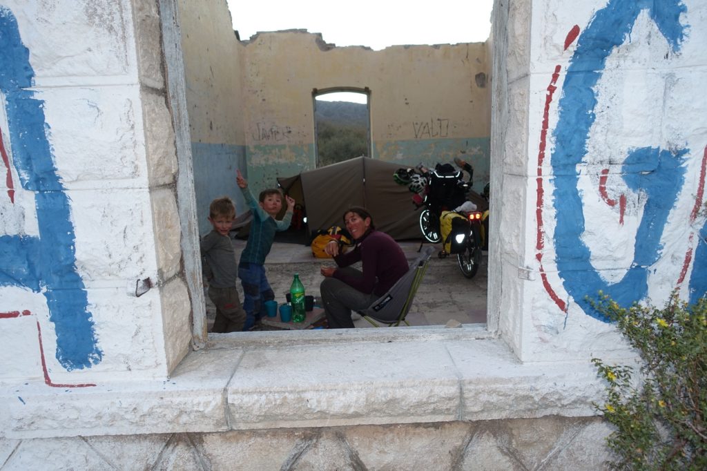 Nous sommes fatigués, il y a du vent… Nous allons nous poser ici. Papa a repéré un emplacement entre des vieilles maisons abandonnées. Il file monter la tente pendant que Maman reste rédiger les articles et que les enfants jouent.
