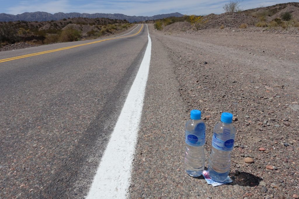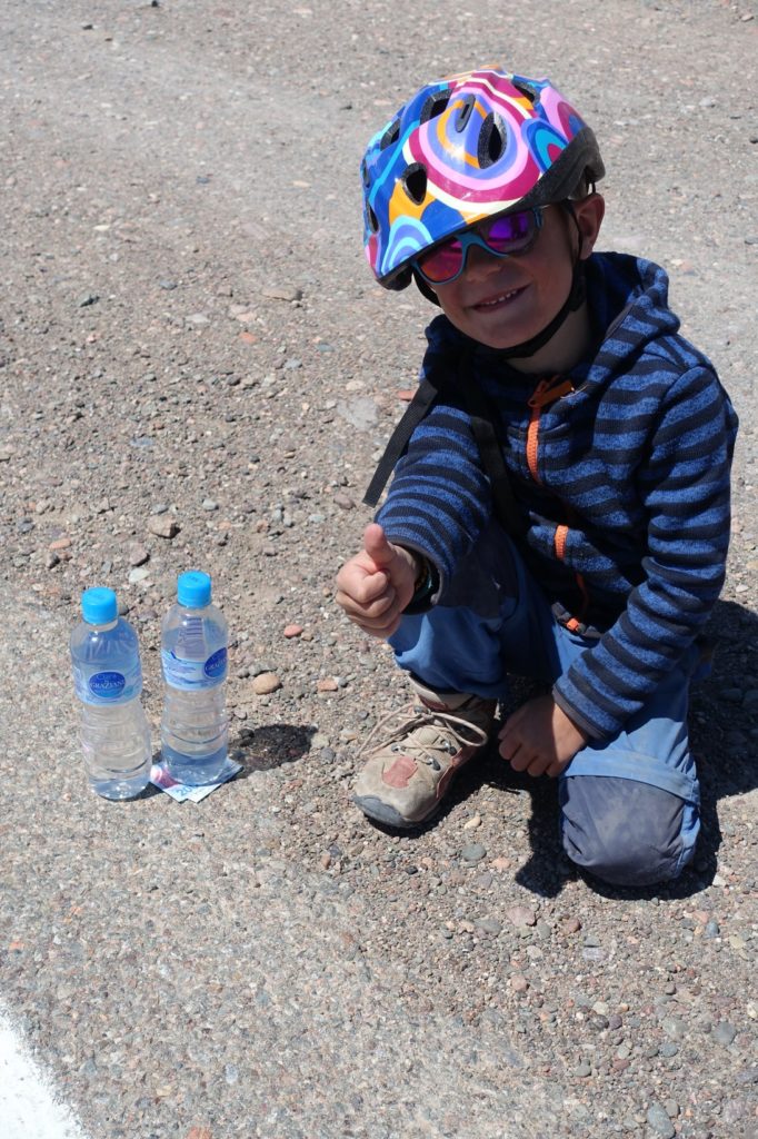 L’une des voitures s’arrête mais repart avant que Maman ne la rejoigne. Bizarre… Maman avance un peu et découvre deux petites bouteilles d’eau avec de l’argent ! Merci au bon samaritain 🙂