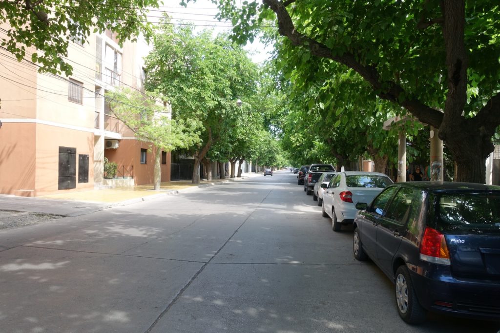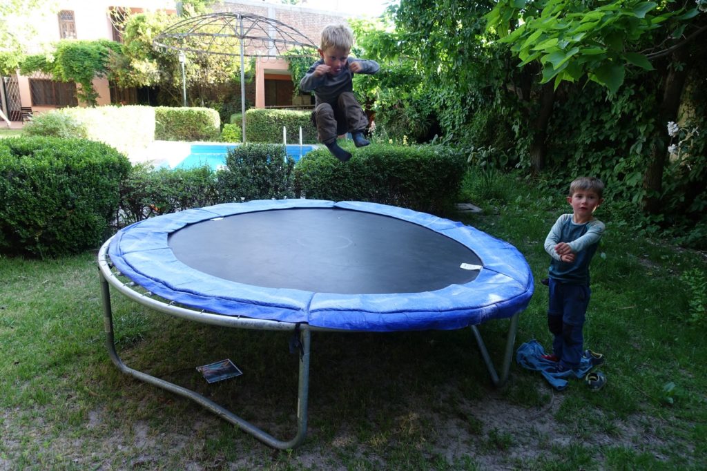 Petite pause geocaching mais nous faisons chou blanc. Nous profitons du wifi de la place de Chimbas pour contacter Celina, notre warmshower. Puis nous allons à San Juan déguster une glace. De nouveau pause geocaching et wifi, Celina n’est pas là mais quelqu’un peut nous ouvrir. Cool ! Nous nous rendons chez elle, sommes accueillis par trois personnes de passage eux aussi. La maison a un grand jardin, un trampoline et même une piscine ! Le top !