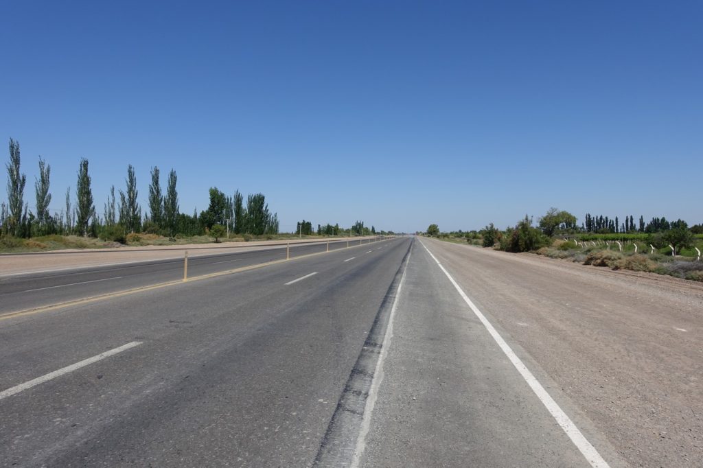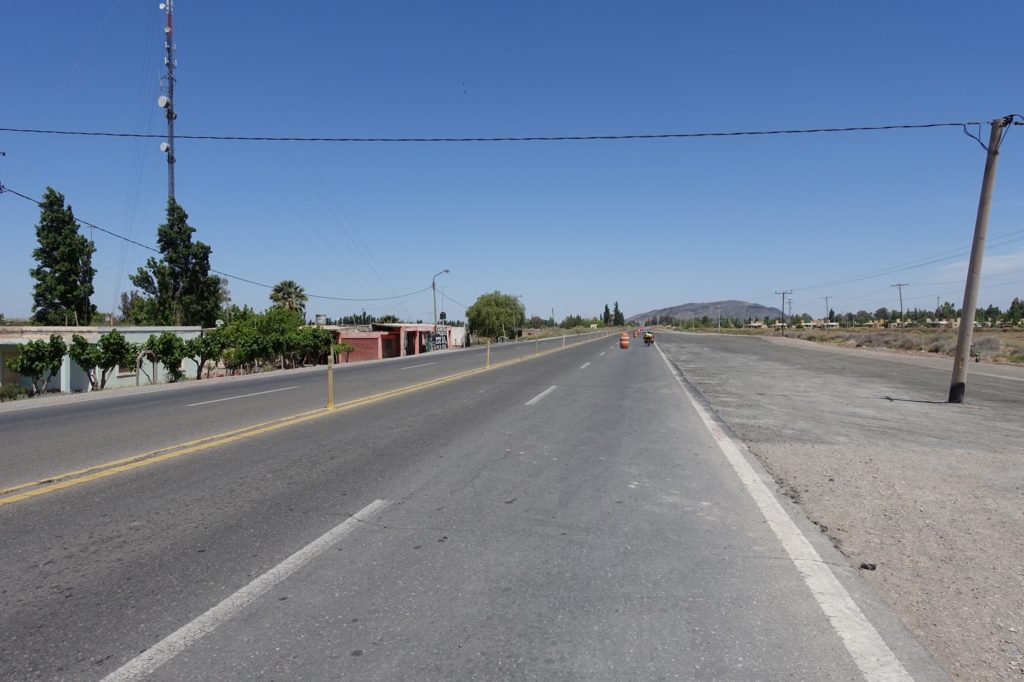 Nous prenons le déjeuner sur une place juste avant de rejoindre la ruta 40. Puis changement radical ! Nous rejoignons une 2×2 voies. Heureusement, c’est dimanche, il n’y a pas beaucoup de circulation, demain, ça risque d’être bien différent. Il y a de nombreux travaux, souvent, le bas-côté est bien large et en bon état. Le vent nous freine comme à son habitude mais nous avançons à un bon rythme.