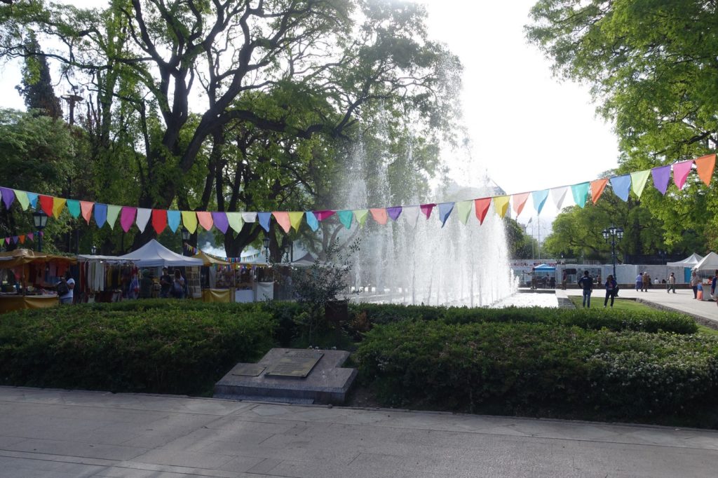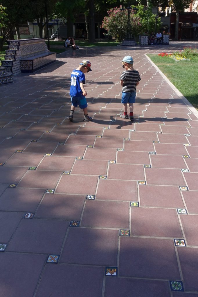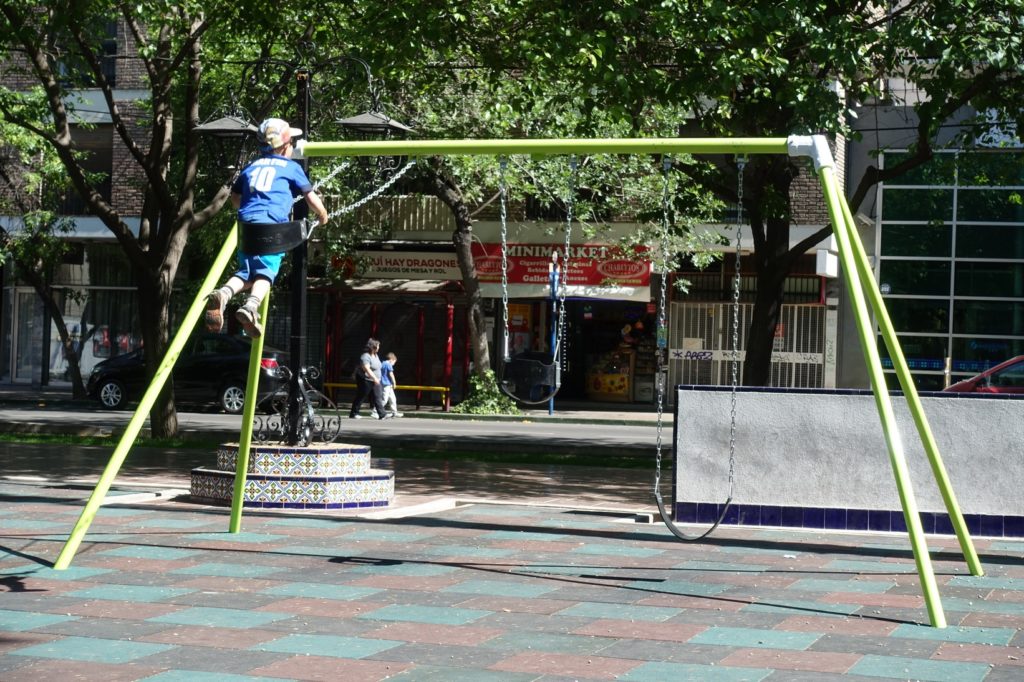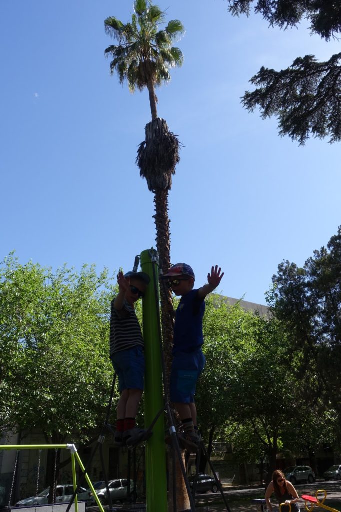 Maman doit se trouver une nouvelle veste de pluie pour affronter la Patagonie. Nous allons donc en ville. Pour réussir à faire marcher les enfants, nous faisons des pauses dans toutes les aires de jeux que nous passons. Ceux de la Plaza España plaisent particulièrement aux enfants. De plus, il y a beaucoup de mosaïques sur le sol, nous nous amusons à qui trouvera le premier une mosaïque en particulier.