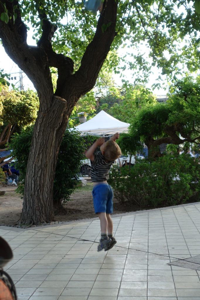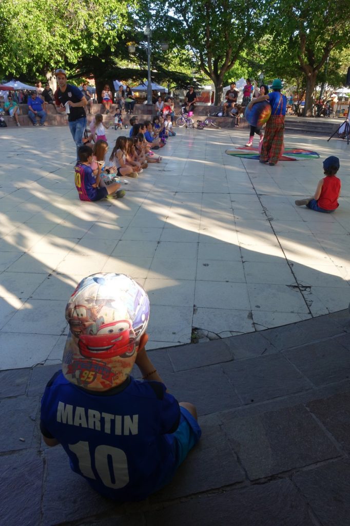 A peine arrivés, nous mangeons tous une glace. Nous allons sur la place, il y a un petit marché artisanal mais surtout, il y a un spectacle de clowns. Les enfants adorent ! Peu après, Lucas essaye de reproduire un tour où le clown lance son chapeau avec le pied et le récupère sur sa tête.
