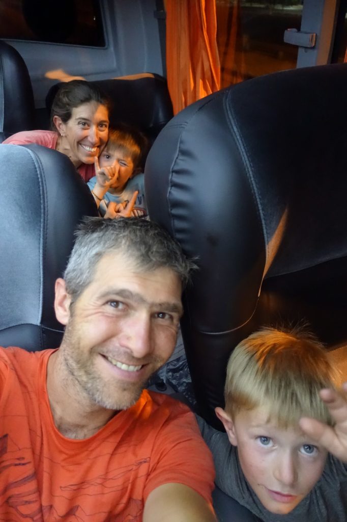Ne sachant pas de quelle plateforme notre bus part, le taxi nous dépose un peu au hasard. Nous avons de la chance, nous sommes pile poil au bon endroit ! Heureusement car tous nos sacs ne sont pas faciles à transporter sans nos vélos. Nous avons tout de même réussi à bien tout empaqueter !