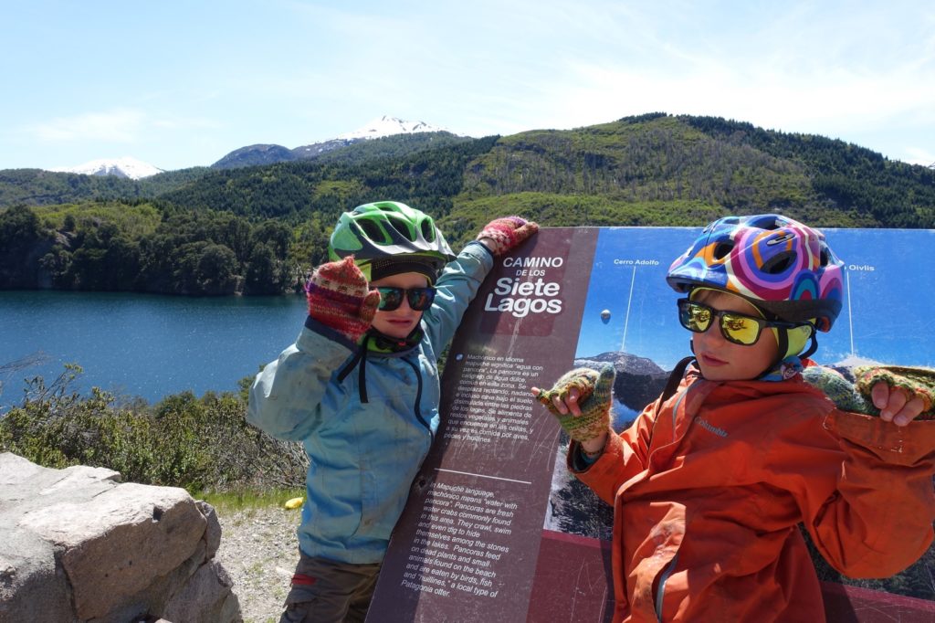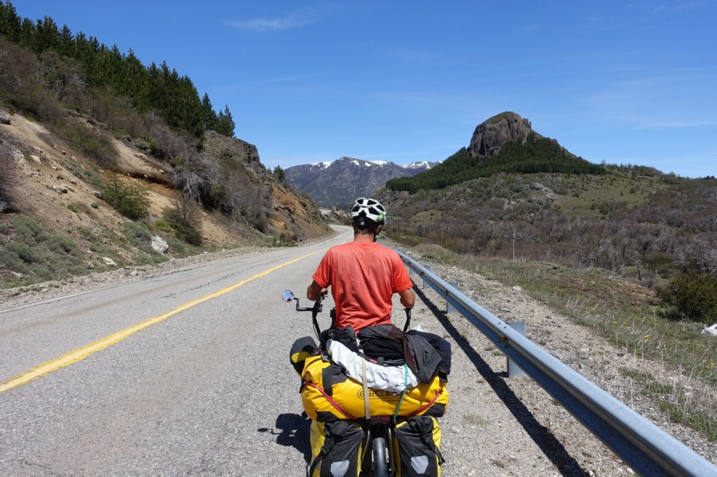 Tout est relativement vite prêt. Pendant les préparatifs, Martin et Lucas en profitent pour faire du vélo sur le trottoir. Et ça y est, nous retrouvons nos selles. Le vent souffle mais nous n’y prêtons pas grande attention. L’étape commence par une montée de 20 km avec 600m de dénivelé. Au début, ce sont des montagnes russes puis ça grimpe. Nous ne forçons pas et y allons doucement, Maman a toujours un peu mal malgré les 10 jours de repos… Après avoir quitté le lac, nous arrivons dans la montagne. Tout est beau, ça change des lignes droites du désert ! Nous passons même à côté d’une station de ski. Seul petit bémol, nous sommes doublés par un pick-up, il est très énervé de nous voir sur la route, il nous klaxonne et nous fait un signe peu sympathique avec ses doigts… Heureusement que ce n’est pas comme ça avec toutes les voitures.