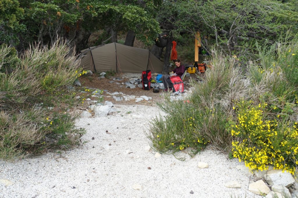 Une dernière rivière à traverser et nous arrivons à l’endroit ciblé. Le bord de la route a été réaménagé, le petit chemin pour rejoindre le lac n’est pas évident à trouver mais nous finissons par le dénicher ! La tente rentre au millimètre près entre arbres et rochers… Et nous voilà installés au paradis !