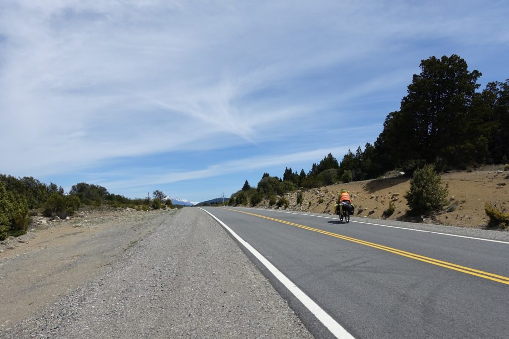 Nous rejoignons la route qui vient de Neuquén. Il y a beaucoup de trafic sur cette portion, surtout des bus. Il nous faut surveiller notre rétroviseur constamment, c’est fatigant… Ayant presque fait demi-tour, nous avons le vent de face. Mais nous ne nous plaignons pas, il nous a aidé ces derniers jours.