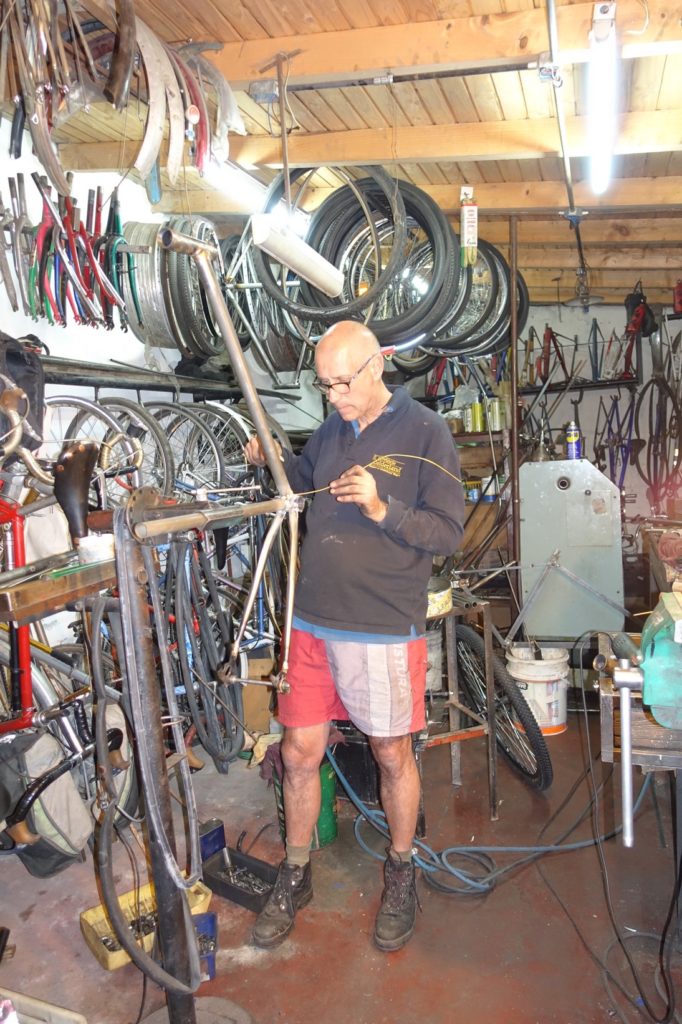 L’un de ses vélos nous a épatés, une copie d’un Hirondelle monté en retro-direct : quand on pédale en avant, on utilise le petit pignon, quand on pédale en arrière, on utilise le grand pignon !