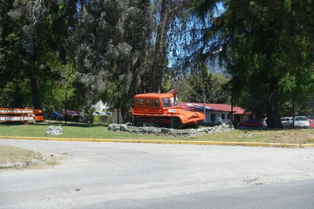 Ah, la route… Encore beaucoup de circulation aujourd’hui. Nous passons devant l’école militaire de montagne avec son scooter et sa voiture des neiges.