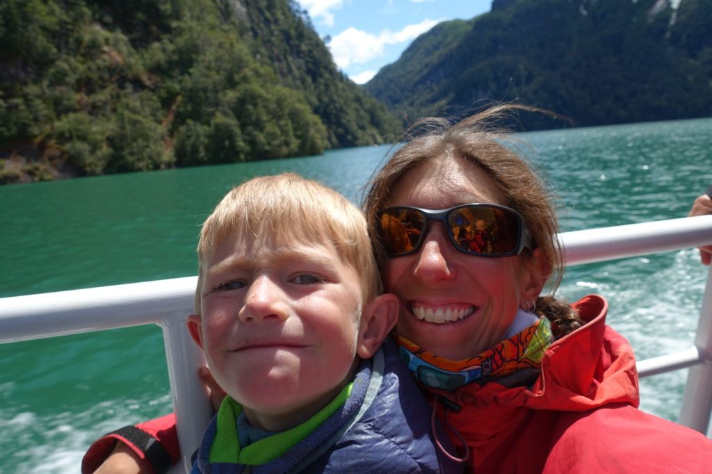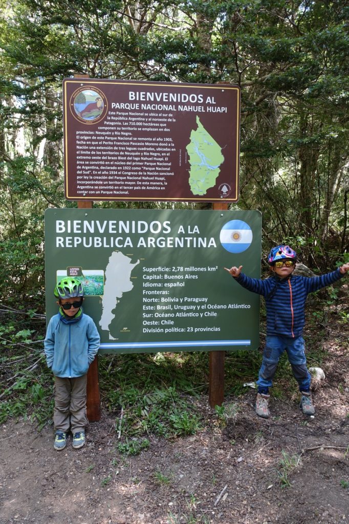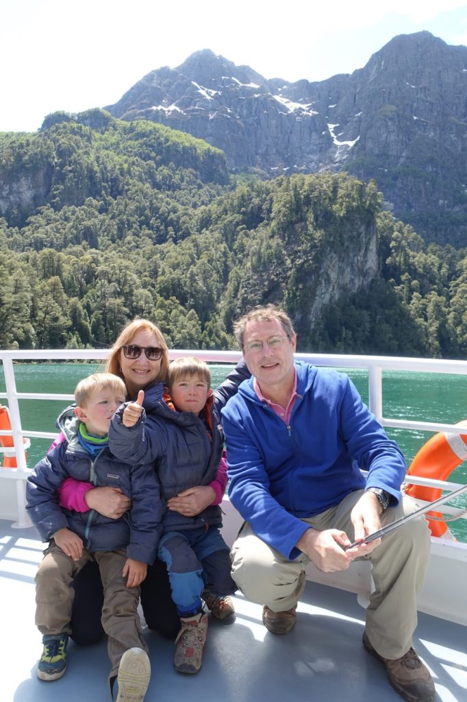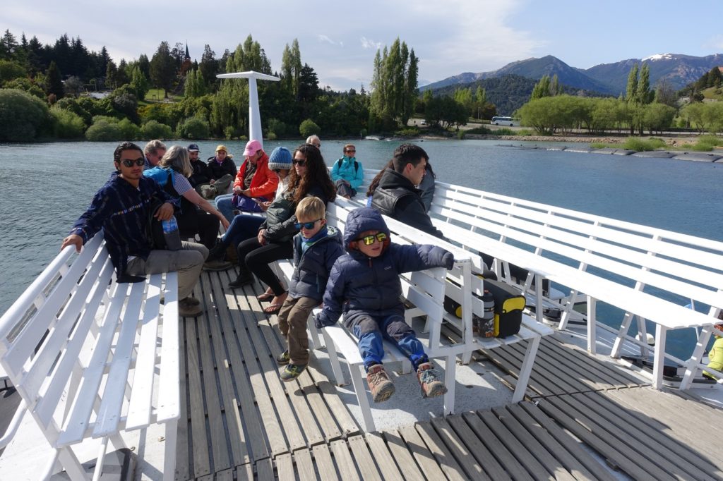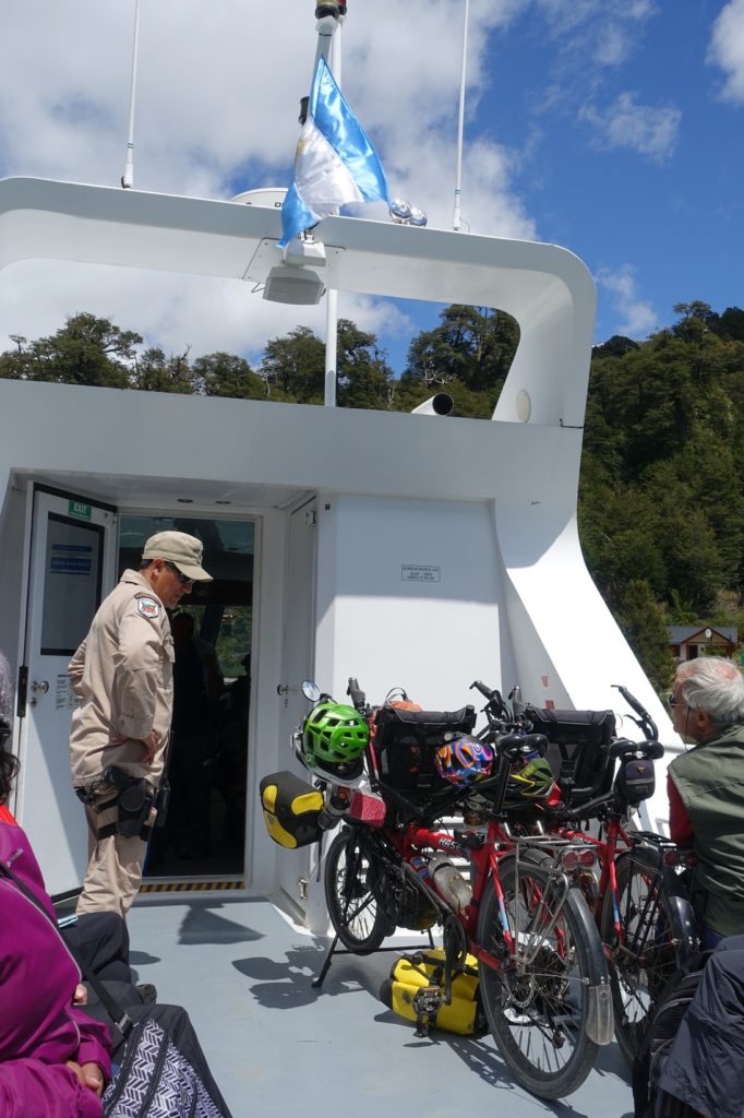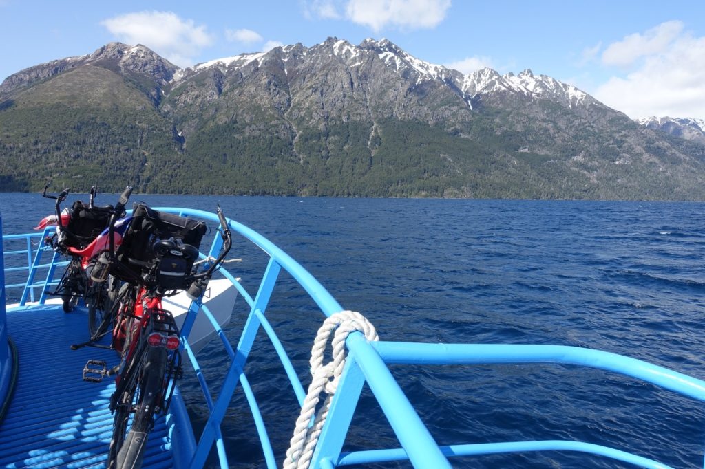 C’est parti pour la première traversée, sur le lac Nahuel Huapi. Nous nous étions mis dehors mais rapidement, avec le vent, les enfants ont froid. Nous descendons donc dans la cabine. Maman part faire un petit tour à l’avant et retrouve les vélos. Ils profitent de la vue !