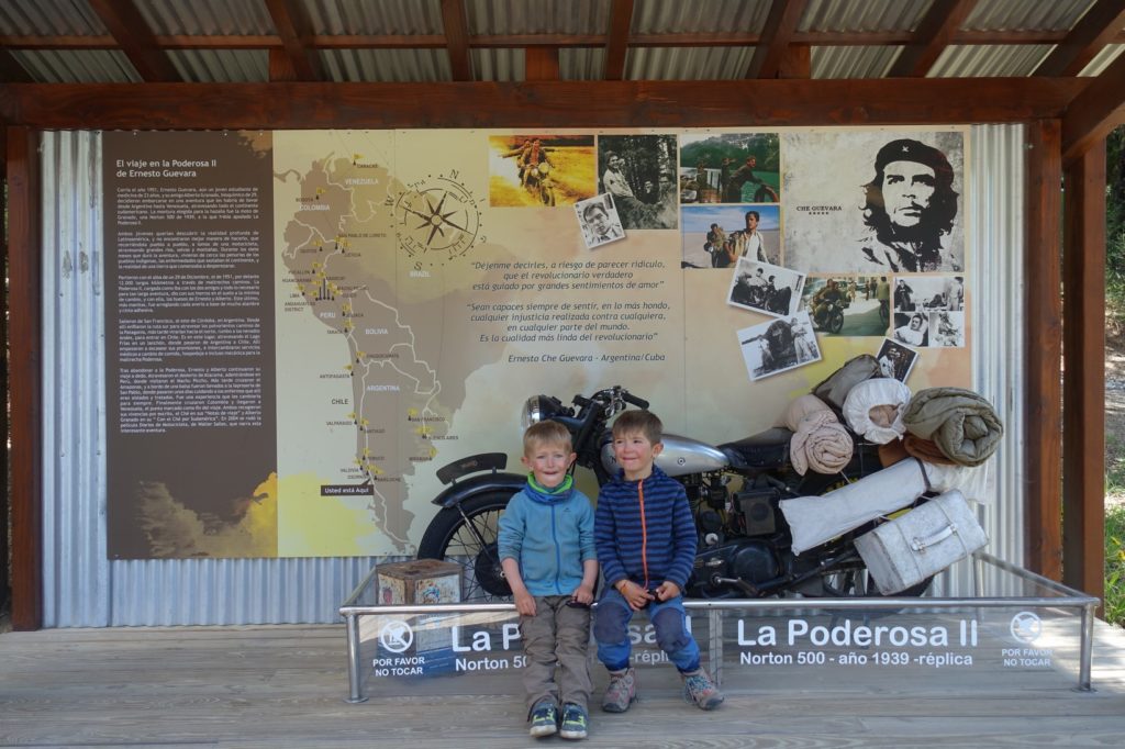 Nous récupérons toutes nos affaires. On nous propose de charger nos sacoches dans le camion mais nous ne savons pas si nous atteindrons la prochaine étape dans les temps alors nous préférons refuser. En effet, nous avons la possibilité de ne prendre le troisième bateau que demain donc nous n’allons pas nous presser, nous avons tout ce qu’il nous faut pour manger. Nous prenons le déjeuner sur une table de pique-nique et faisons une photo souvenir sur la moto du Che (enfin, c’est une réplique !). Il était passé par là pour aller au Chili.