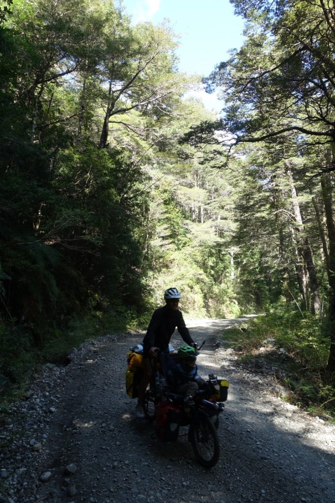 Nous attaquons la descente. C’est la plus dure que nous ayons faite depuis le début du voyage. Elle est très raide, il y a des cailloux partout, nous glissons dans tous les sens. Les vélos partent où bon leur semble. Papa chute et casse un porte-bidon et à moitié l’attache d’une sacoche puis c’est au tour de Maman. Là aussi, l’attache d’une sacoche ramasse. Elle fixe tout ça comme elle peut pour que ça tienne jusqu’en bas. Nous sommes tous éreintés, la descente est au final plus fatigante que la montée ! De plus, elle dure 9 km, c’est long !
