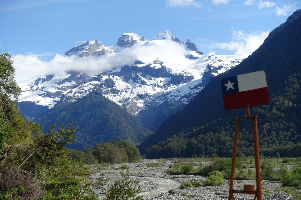 Ça y est, nous avons atteint le rio ! La sortie de la forêt se fait au niveau des carabineros. Nous voyons un endroit pour poser la tente et une table, nous leur demandons donc si nous pouvons camper là, aucun soucis et c’est tant mieux ! Il est déjà presque 18h00 et nous n’avons pas envie d’aller plus loin. En plus, nous avons vue sur le Monte Tronador ! C’est idéal !