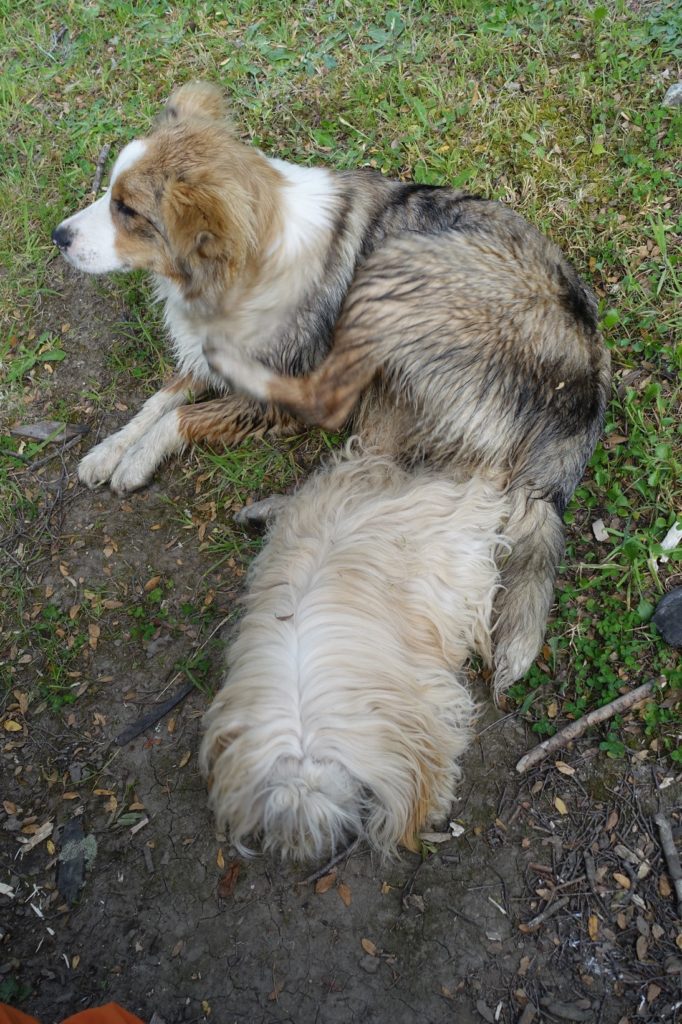 Tout est en place, Lucas est allé se coucher dans la tente pour ne pas avoir froid. Il refuse de venir dîner et reste au lit. Nous sommes rejoints par les chiens de nos voisins d’un soir, les chats sont plus timides et n’osent pas traverser la route.