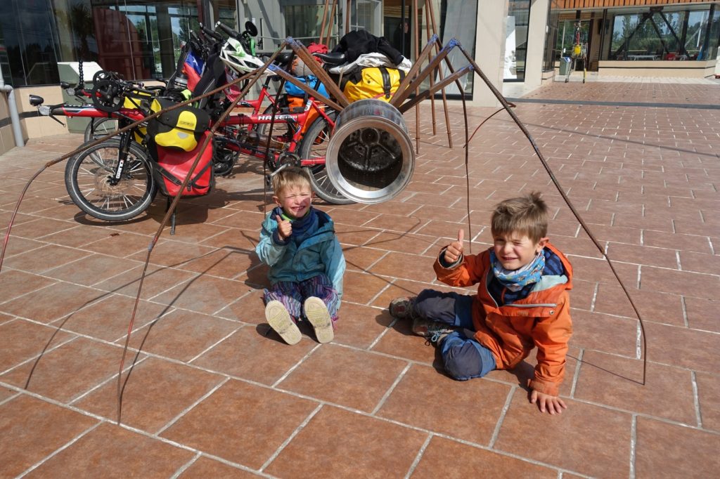 Nous prenons notre petit-déjeuner, nous sommes lents ce matin. Nous regardons toujours où nous pourrions dormir ce soir. C’est bien la première fois que nous nous préoccupons vraiment de notre point de chute. Mais il faut dire que les hébergements sont chers au Chili ! Au final, nous partons sans avoir rien trouvé. Ah si, des bouchons de valve pour Fred ! Juste avant de partir, le vélo de Papa finit par terre sur le parking, et crac, de nouveau des attaches de cassées ! Ce coup-ci, nous n’en avons plus de rechange, il va falloir se débrouiller. Elles tiennent encore un peu, ça devrait faire l’affaire.
