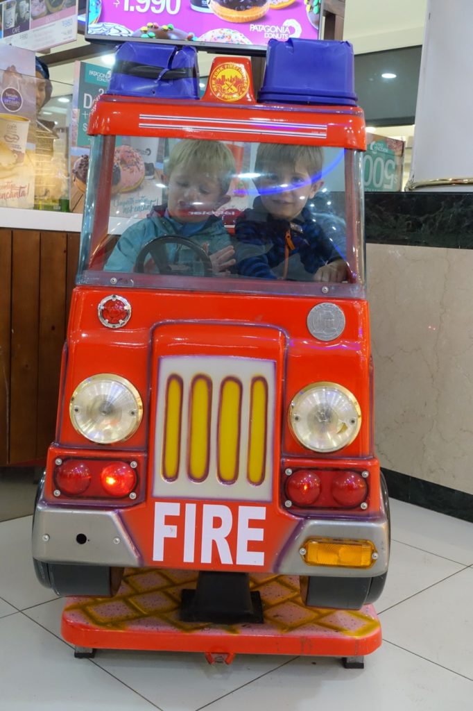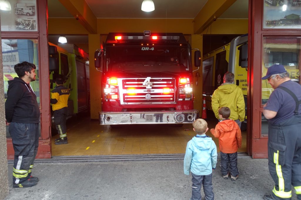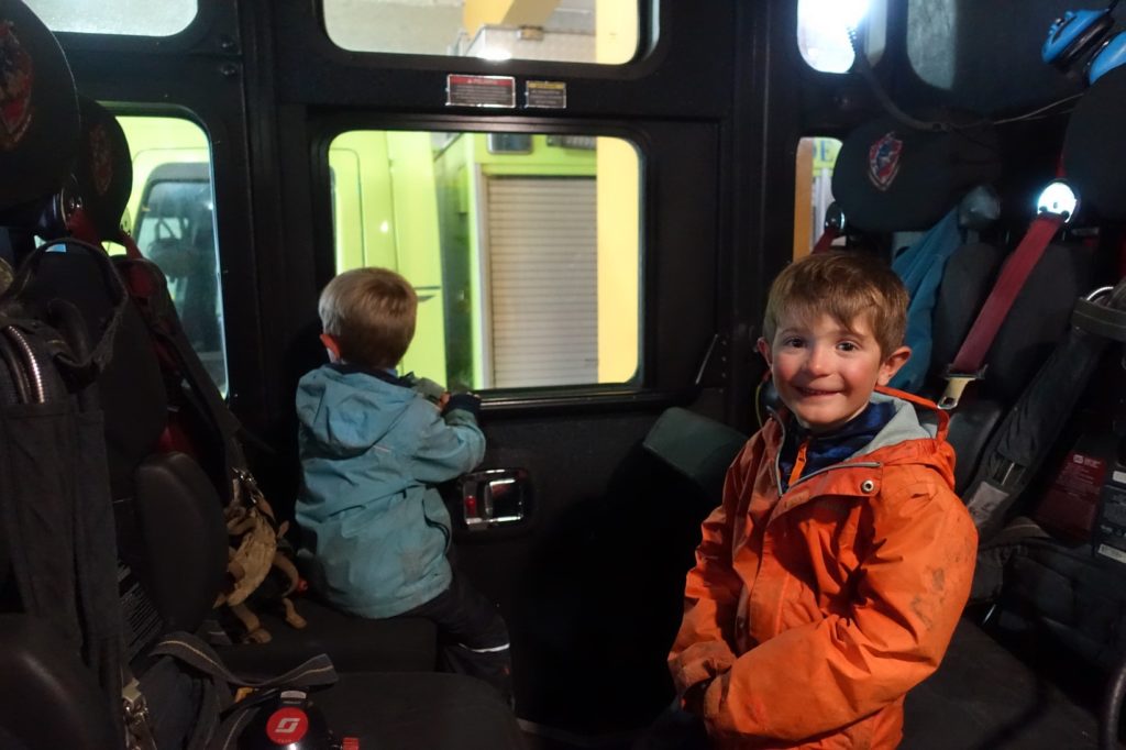Les 2 kilomètres sont rapidement faits en voiture. Nous sommes déposés juste devant une caserne de pompiers. Un camion tourne, nous allons le regarder de plus près. Un pompier nous invite à monter à bord ! Les enfants sont contents mais au final déçus, ils pensaient aller faire un tour (comme en Equateur).