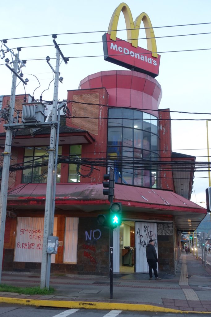 Nous faisons une pause sur le chemin du retour pour manger au Mc Donald’s. Il y a des traces des récentes manifestations. Toutes les vitres sont cassées et la plupart des bâtiments sont barricadés. A l’intérieur c’est glauque. A 21h00, la porte est déjà fermée !
