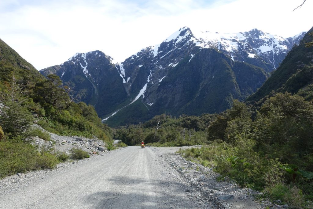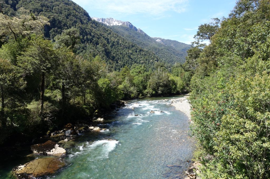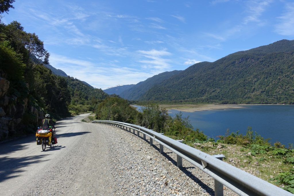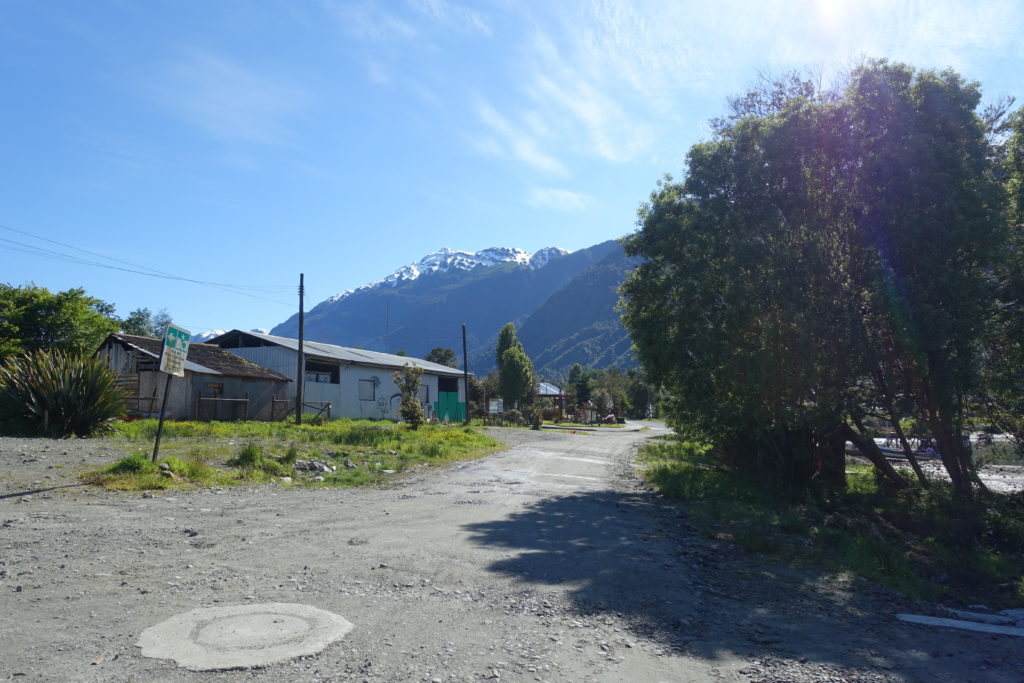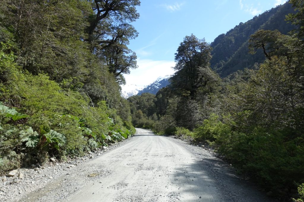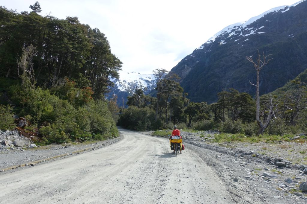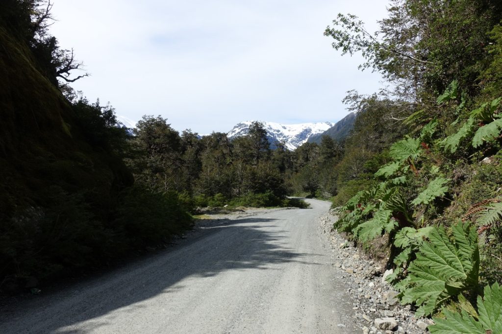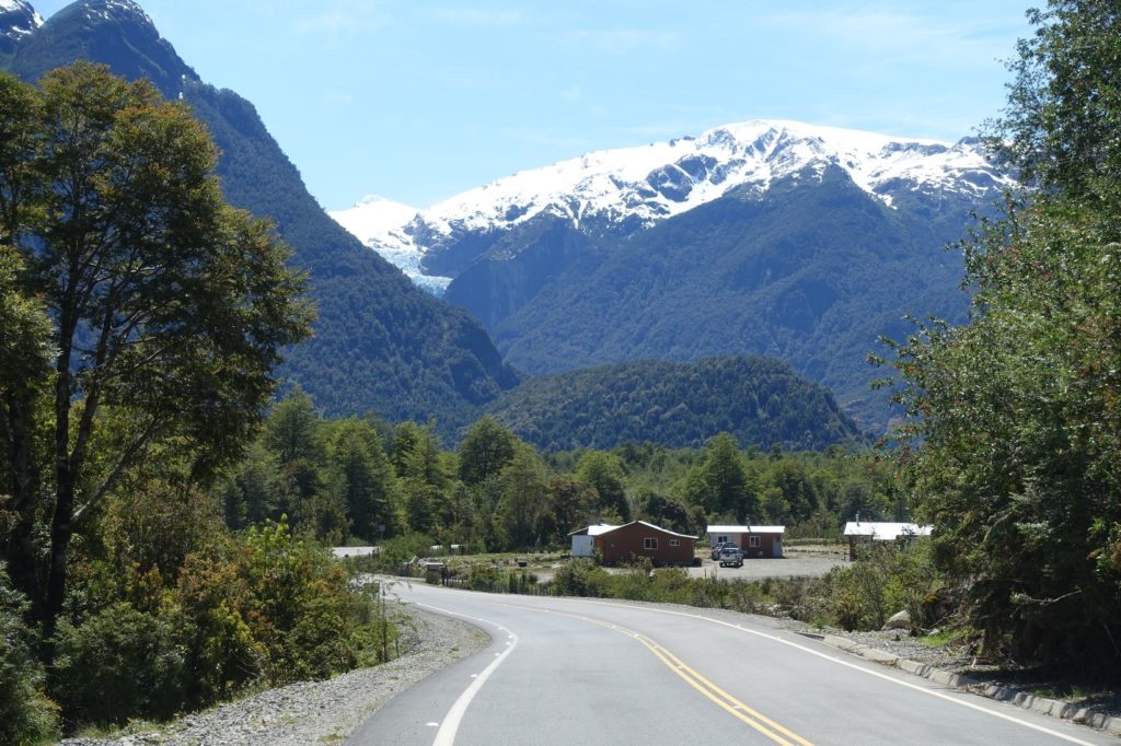 Nous retrouvons le bitume avec un passage un peu plus dans les terres. Nous faisons une pause grignotage. Les montagnes enneigées ne sont vraiment pas loin, en nous retournant, nous voyons le glacier Ventisquero Colgante. Les panneaux kilomètres changent de nouveau. Maintenant, ils annoncent la distance de Coyhaique, du coup, ils diminuent. Les distances des différentes sont fausses. Bref, c’est du grand n’importe quoi…