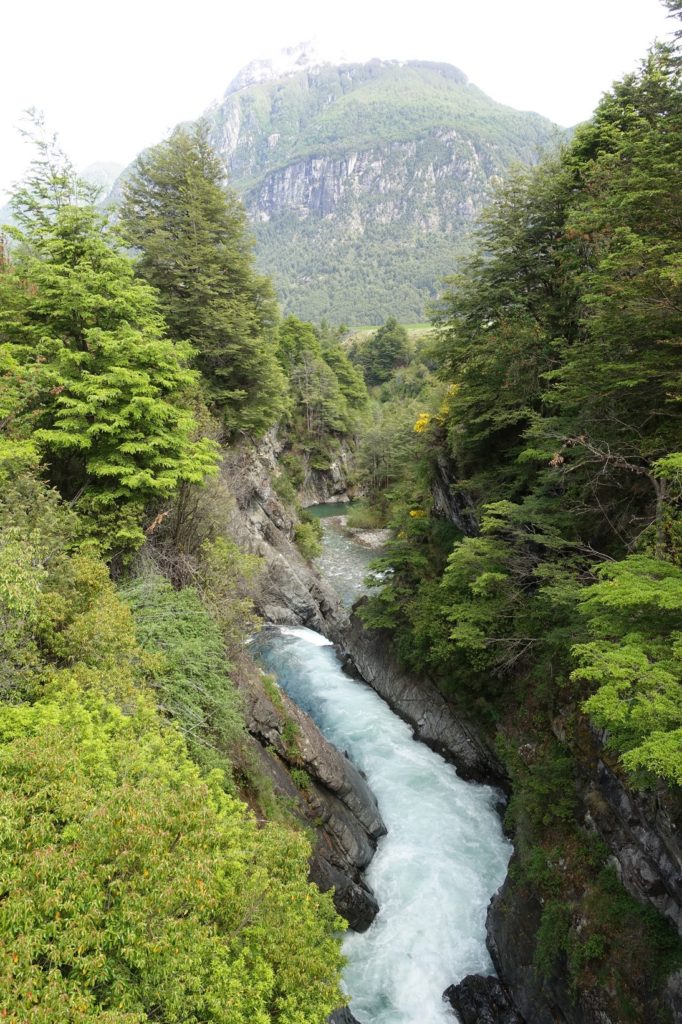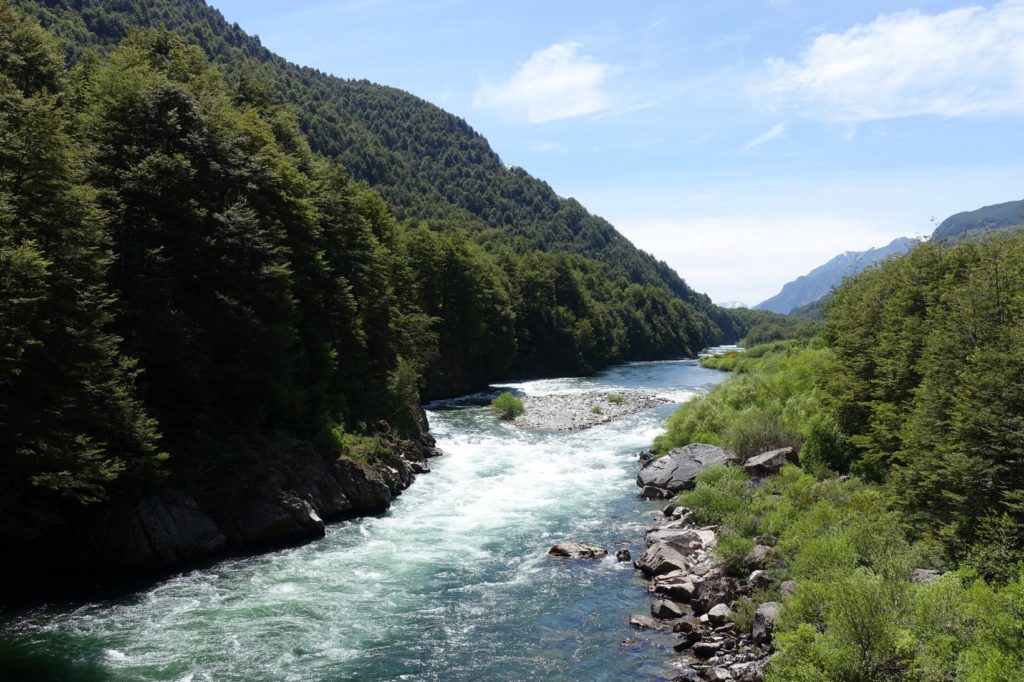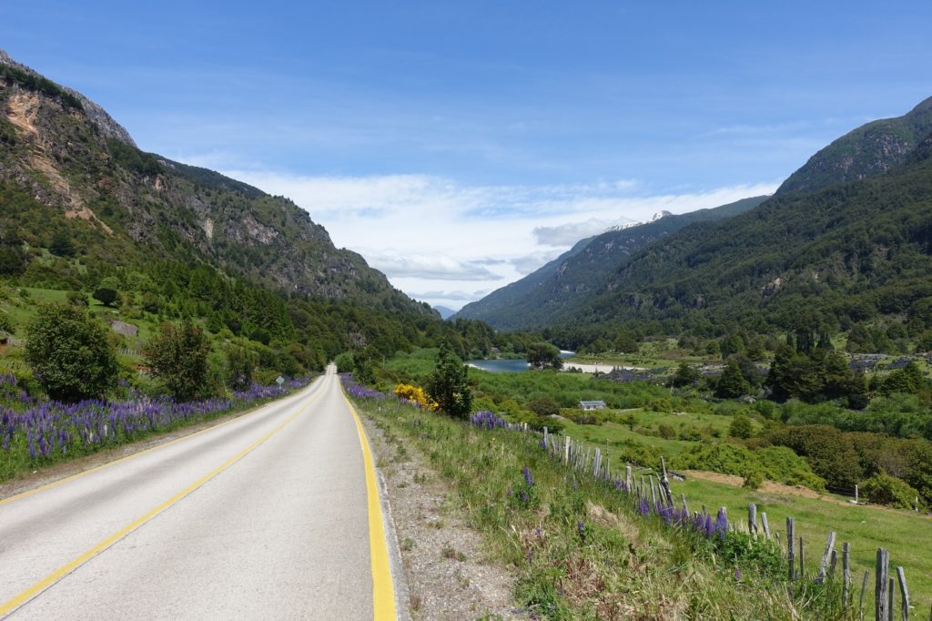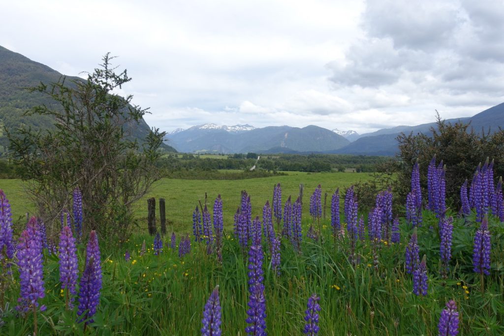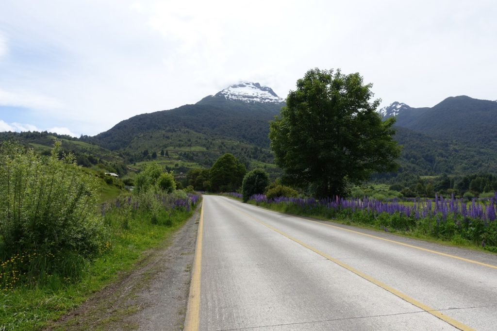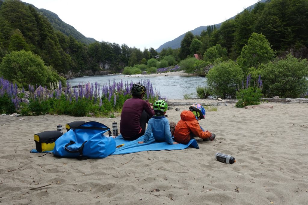 Nous repartons, la circulation s’intensifie. C’est peut-être parce que nous nous rapprochons de Puerto Aysén. La route est tout de même agréable même si, peu avant la bifurcation, de bonnes rafales de vent nous ralentissent ! Sur les vélos, nous jouons à mettre un animal ou un chiffre dans sa tête. Martin travaille les mathématiques, Maman lui dit un nombre entre 2 et 10 et il doit le montrer en utilisant ses deux mains. Il s’en sort très bien !