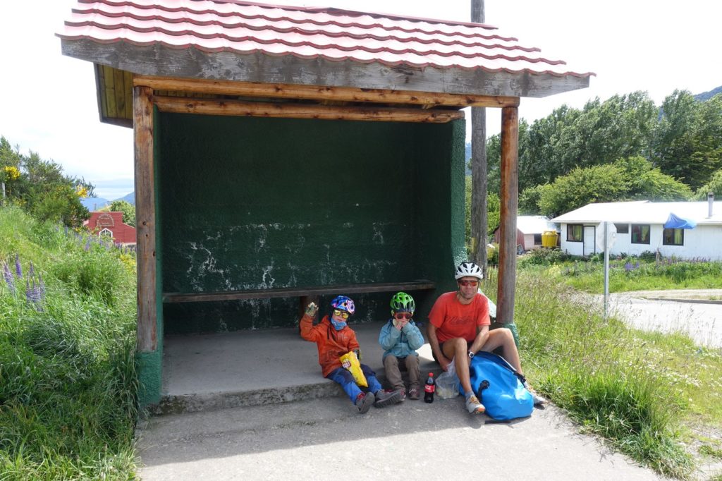 La partie la plus dure est passée et un abri-bus nous fait de l’œil. Nous nous arrêtons pour la pause déjeuner, abrités du vent. Coyhaique n’est plus qu’à 11 kilomètres !