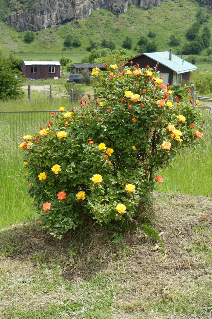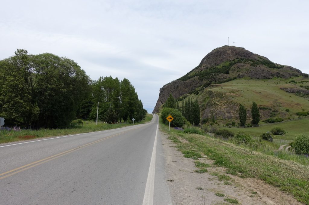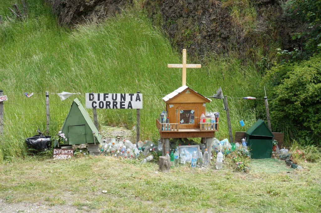 C’est presque à 14h00 que nous partons vraiment ! Heureusement, nous n’allons pas très loin aujourd’hui. Nous disons au revoir à Coyhaique et attaquons des petites montées. Nous avons le vent dans le dos, quel bonheur ! Les paysages nous font vraiment penser aux Alpes. Les kilomètres défilent relativement facilement. Nous passons devant une Difunta Correa, mais que fait-elle ici, elle s’est perdue ? En voyant un beau rosier, nous avons une pensée pour Papi et Mamie.
