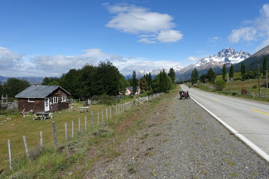 9 kilomètres de descente plus tard (mais tout en pédalant), nous nous arrêtons faire des courses en ville. Il n’y a pas énormément de choix au petit supermarché mais ça fera l’affaire. Nous nous chargeons pour 4 jours, il ne semble pas y avoir grand chose avant Puerto Rio Tranquilo. En ville, le vent souffle très très fort, nous allons l’avoir de face aujourd’hui, ça promet de ne pas être facile !