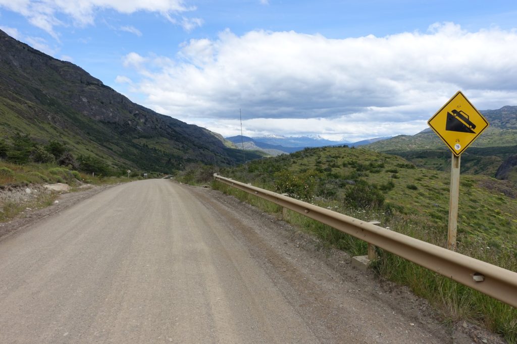 Comme à son habitude, Edson part devant. Nous décollons à notre tour et terminons cette satanée, pardon, splendide, montée. Un troupeau de guanacos nous regarde passer et nous voilà enfin devant notre panneau préféré !