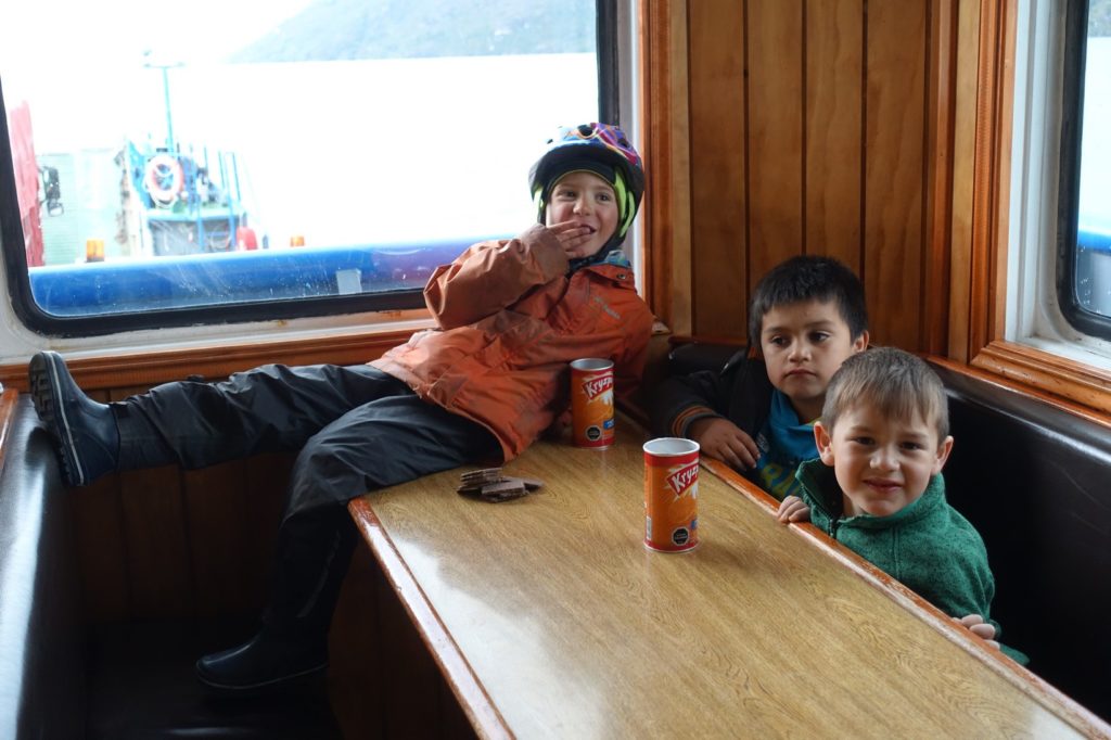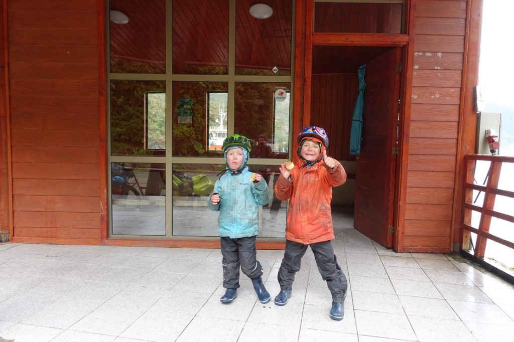 Ça y est, nous en voyons le bout. Nous arrivons à l’embarcadère. Il est 15h45, nous sommes déçus, la cafétéria est fermée, nous pensions nous réchauffer un peu. Nous nous mettons tout de même à l’abri dans la salle d’attente et nous nous faisons un café. Nous discutons avec deux hommes d’un pick-up, Edson est là lui aussi. Martin et Lucas courent partout. Il nous faut attendre 18h00 alors nous patientons…